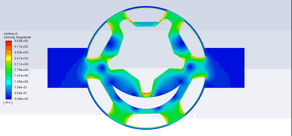 After the solution, we obtained pressure, velocity contours, and velocity vectors. Because the gears rotate over time, we obtained the velocity and pressure contours animation.