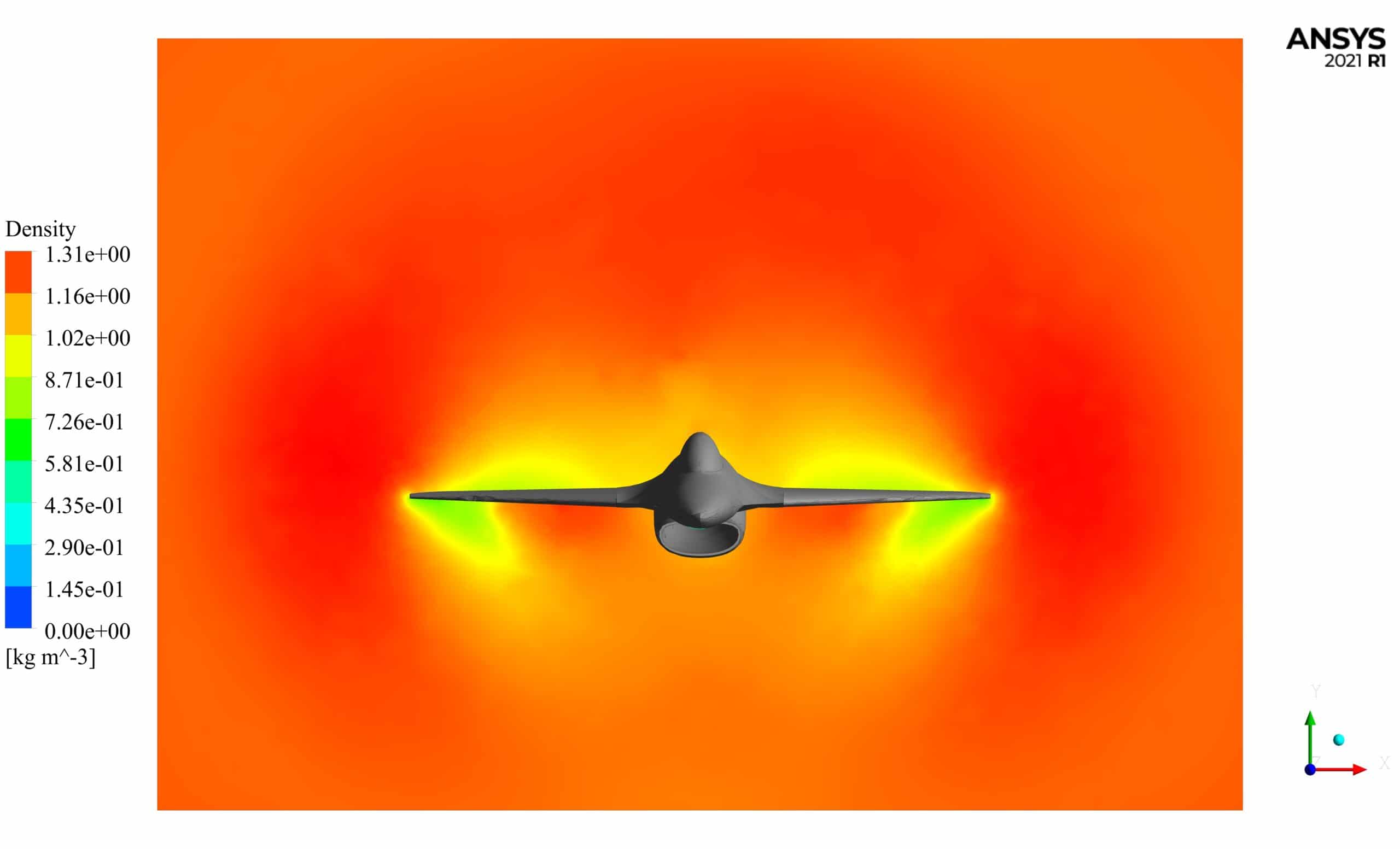 The contours of the simulation clearly show the symmetric distribution of pressure and velocity field around the aircraft. The pressure gets to its highest values below the wings and this pressure gradient causes lift force acts on aircraft. Moreover, there is a strong correlation between pressure, density, and temperature. Note that the fluid is assumed to be inviscid, and as a result, the Navier-stokes governing equation is simplified to Bernoulli’s equation.