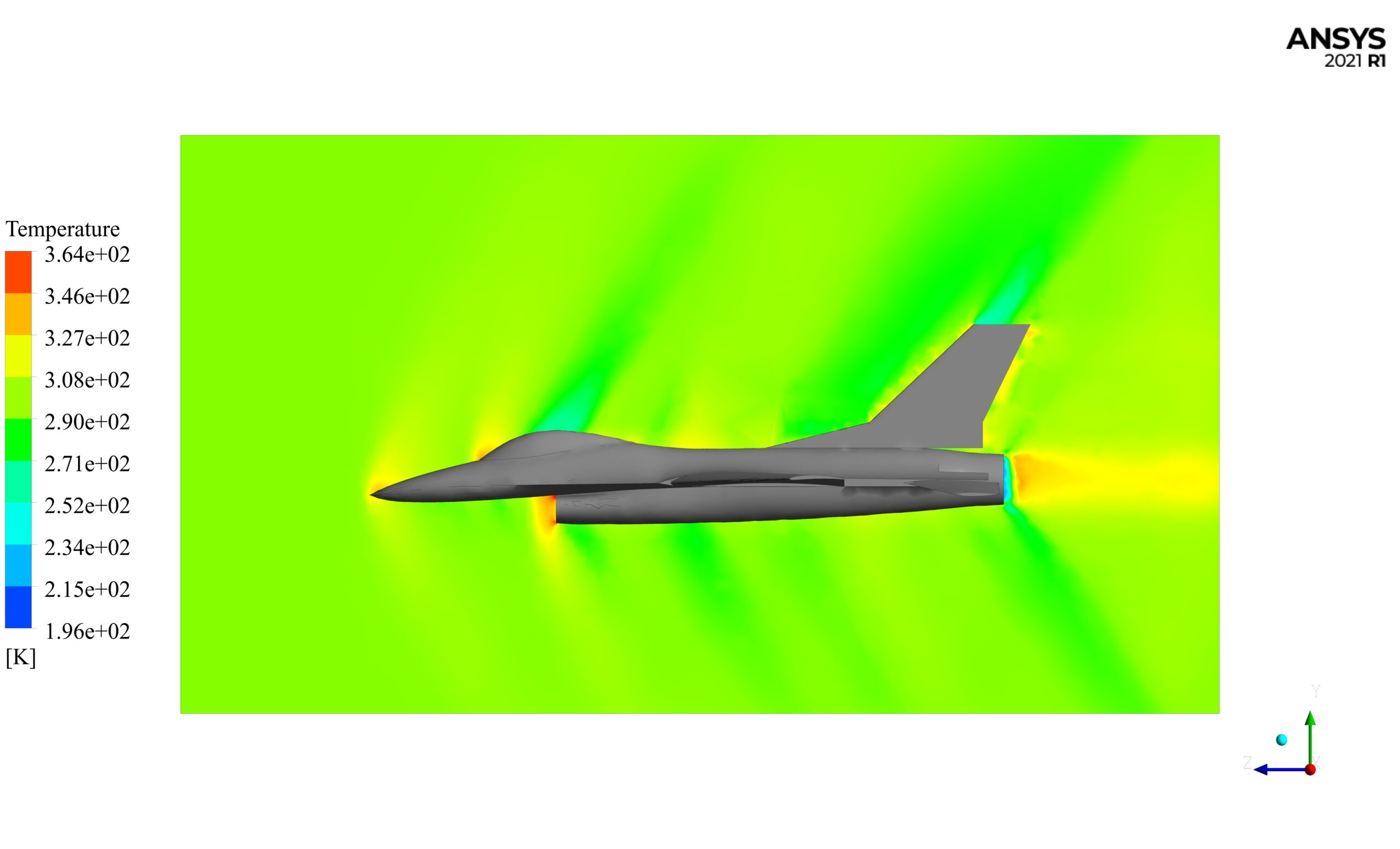 The 3D geometry was imported and generated in Design Modeler software. An F-16 aircraft model is imported and placed at the middle of an enclosure. In addition, an unstructured mesh grid was carried out using Ansys meshing software, and overall, 979273 elements were generated.
