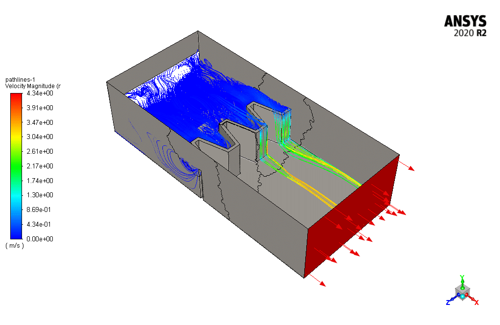 The extra water is discharged from the labyrinth spillway to the downstream river to control the dam level. As the animations and contours show, the incoming water cause turbulence and pushes the stored water downstream. After overflowing from the dam, the flow moves with a higher velocity to the outlet.