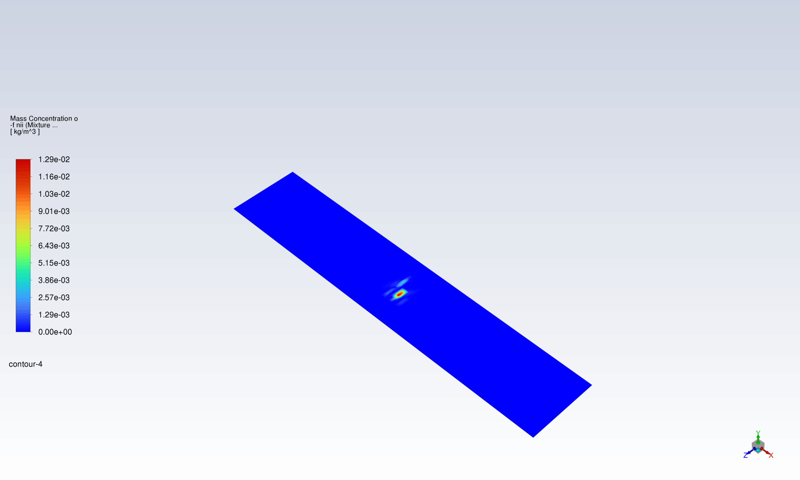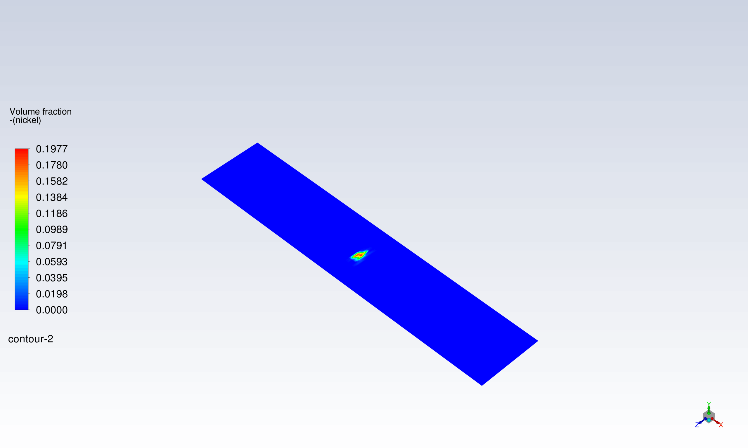 By observing the results, we notice that the speed in the model reaches a maximum of about 75 m/s. And as expected, the temperature around the weld is high. The first layer of weld covered the bottom surface and, as can be seen in the figure below, which shows the volume fraction of the nickel phase, new particles join it and spread over the first layer. In addition, animations are attached to the report that can clarify the welding process to date.