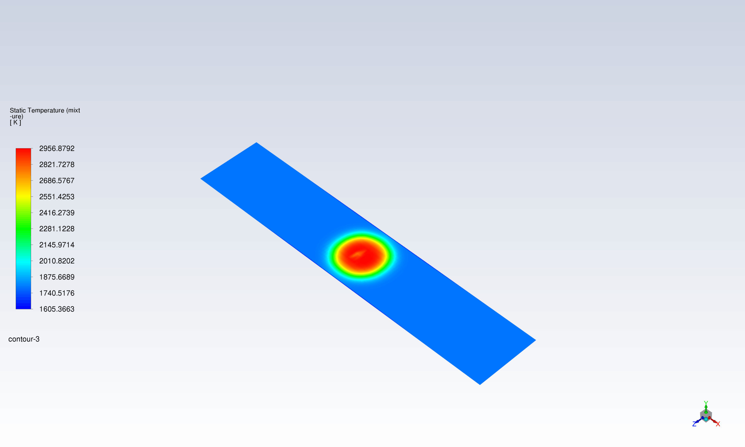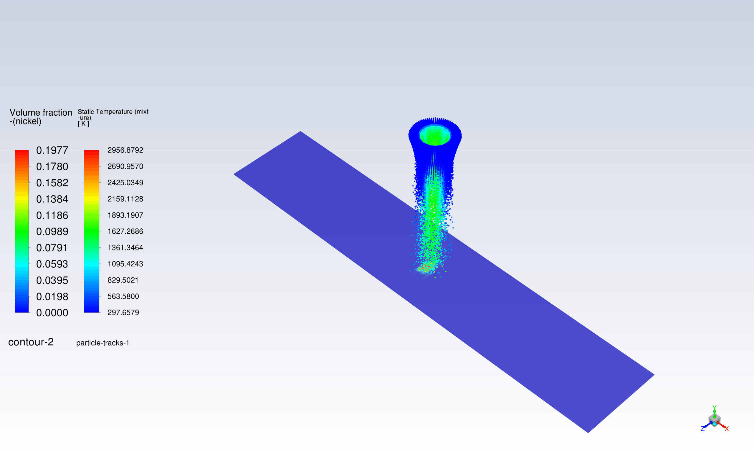 The governing equation was solved using Ansys Fluent, the pressure-based solver and transient used for Laser Cladding simulation. The Volume of Fluid(VOF) set for the multiphase model, and Mass transfer is enabled in this model. However, the k-epsilon Relaizable model is used for turbulence with the standard wall function. Additionally, the species transport model is active plus energy. The nickel droplet`s primary temperature is 300K, which is injected at a specific velocity. Plus, the diameters of the particles differ from 1.5e-5m to 4.5e-5m. In other words, the average diameter is 3e-5m. We use mesh motion for the fluid zone in the cell zone condition. The Gaussian distribution on the moving wall is applied using a user-defined function (UDF).
