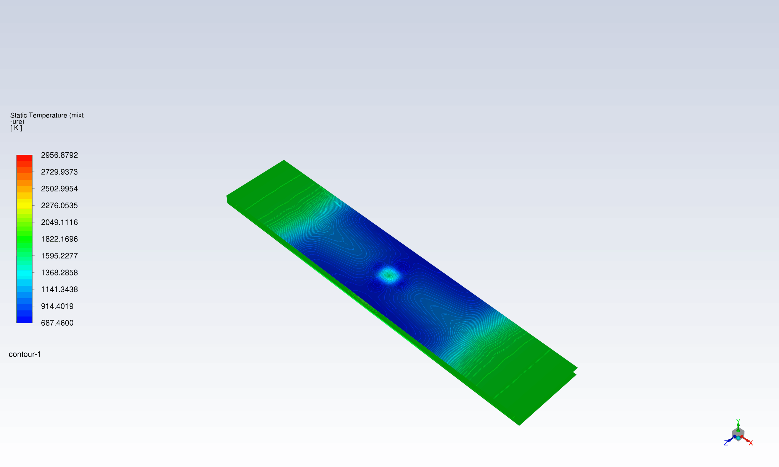 - The three-dimensional geometry was created in Design Modeler with a computational domain of 0.05 × 0.01 × 0.025 m. A structured non-conformal mesh was generated in ANSYS Meshing, consisting of approximately 798,400 computational cells with refined regions near the deposition zone.