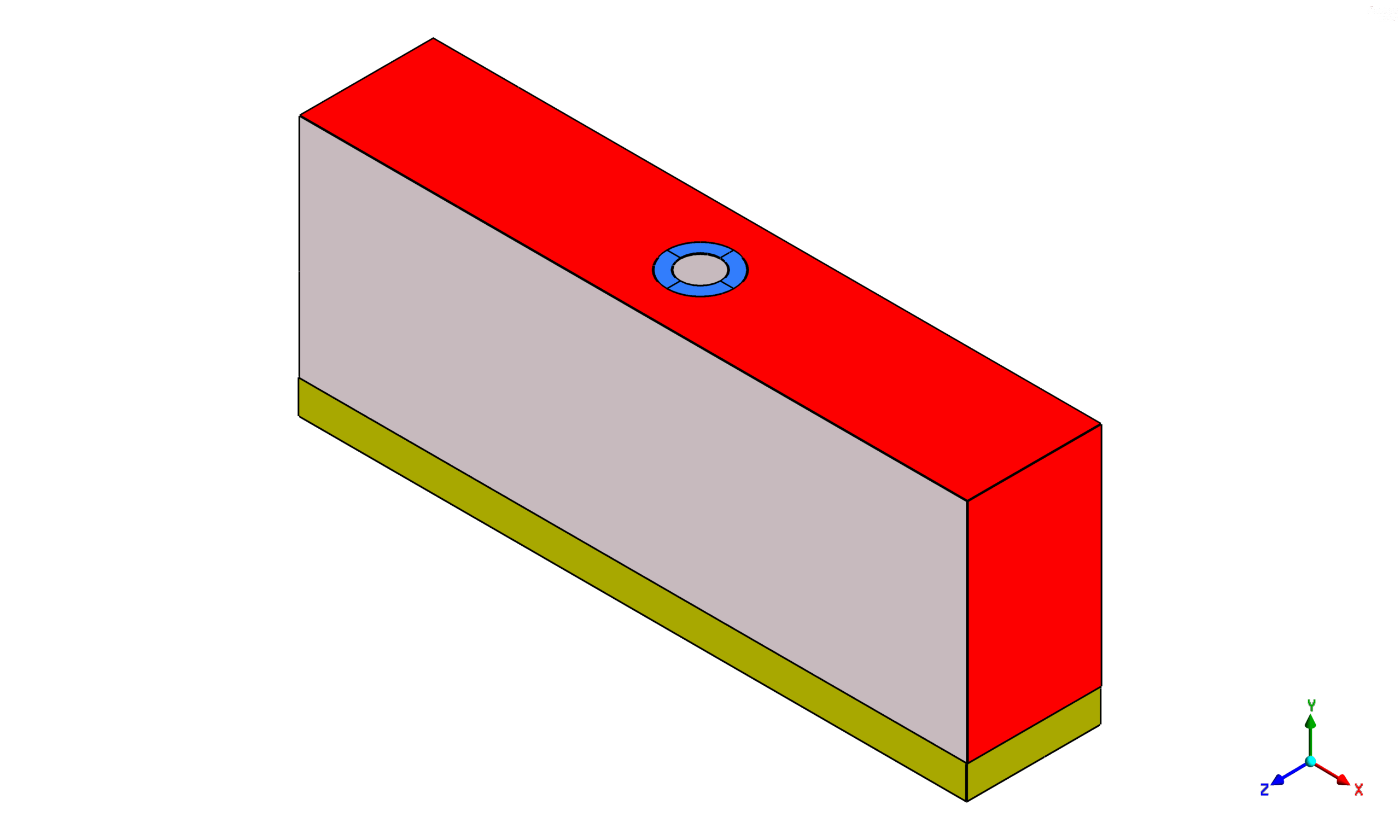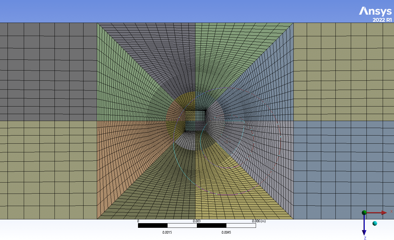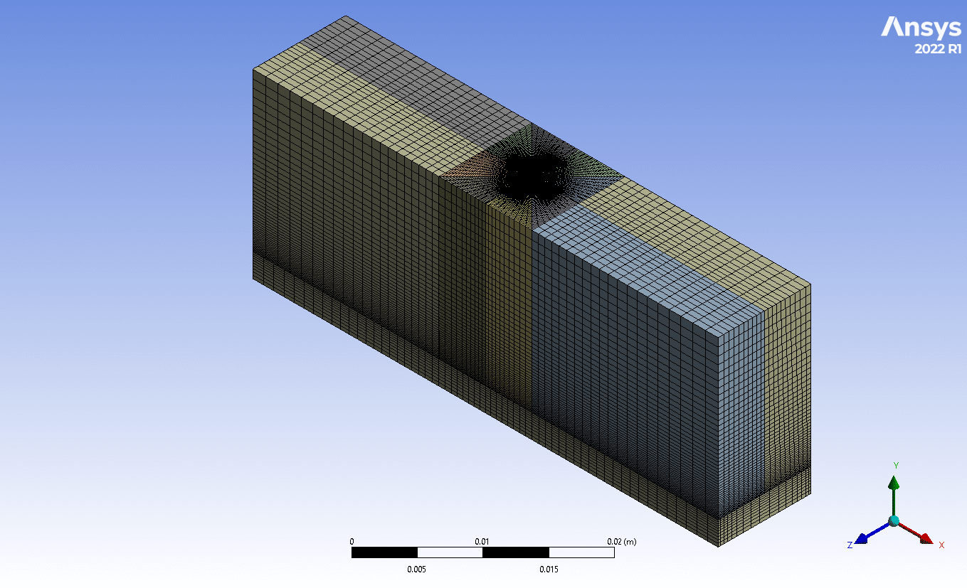 The geometry of the laser cladding is drawn using the Design Modeler. Three zones are drawn in this software; two are fluid zones, and the 3rd one is a solid zone based on the model. The geometry is divided into several blocks because we want to generate a structure mesh. Additionally, the size of the domain is 0.05*0.01*0.025. Then, the geometry is inserted into the ANSYS Meshing software to generate a non-conformal mesh, and a total of 798400 cells are generated in this software.