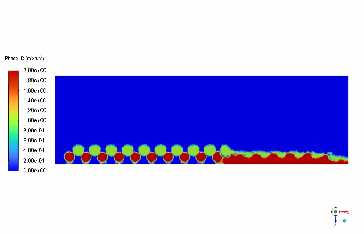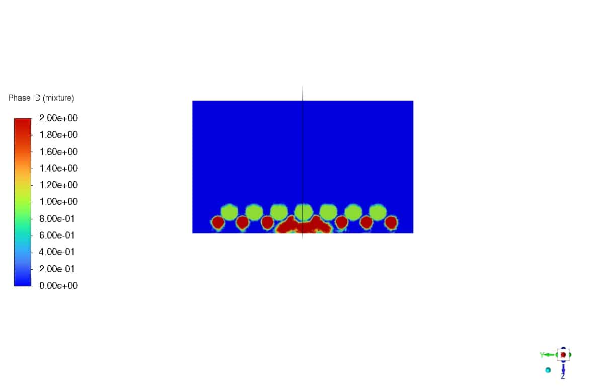 The simulation was configured using a pressure-based transient solver with gravity effects enabled to account for natural convection and potential fluid motion during melting. The Volume of Fluid (VOF) multiphase model was implemented to track three distinct phases: the surrounding air/gas phase and two different particle materials. The laminar viscous model was selected based on the microscale nature of the domain and expected flow characteristics.