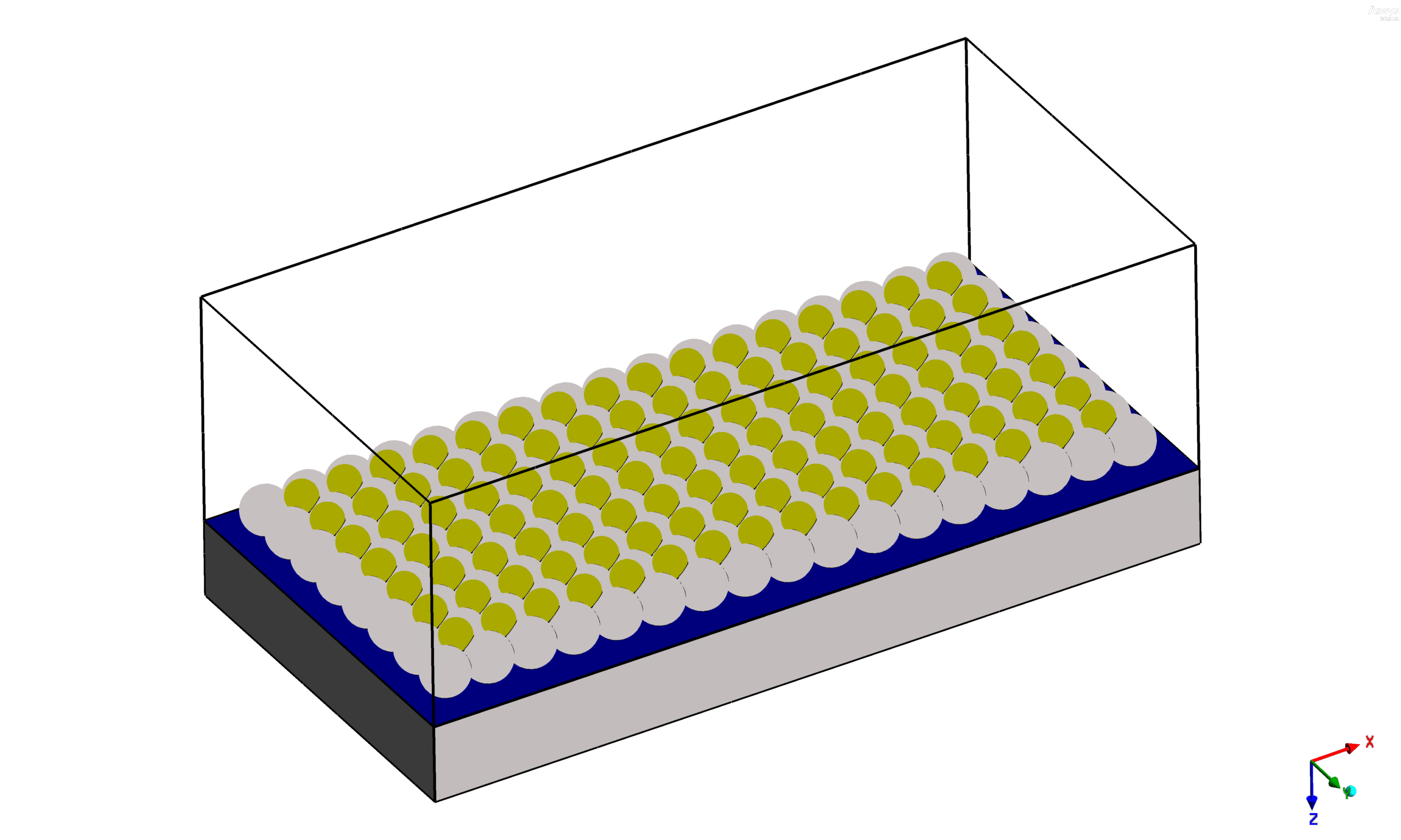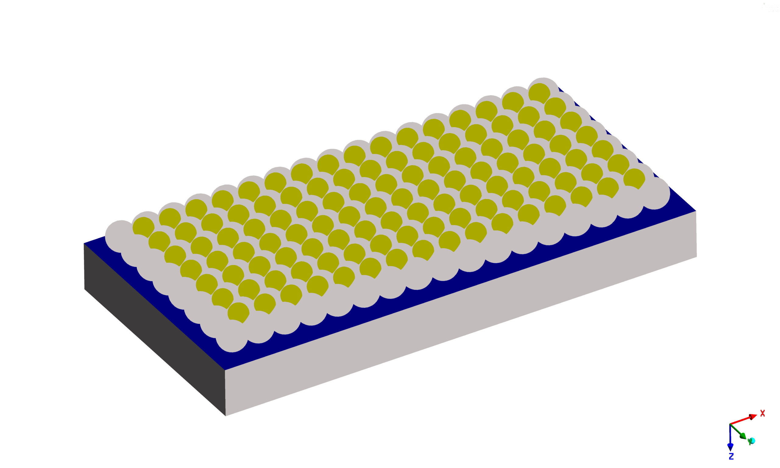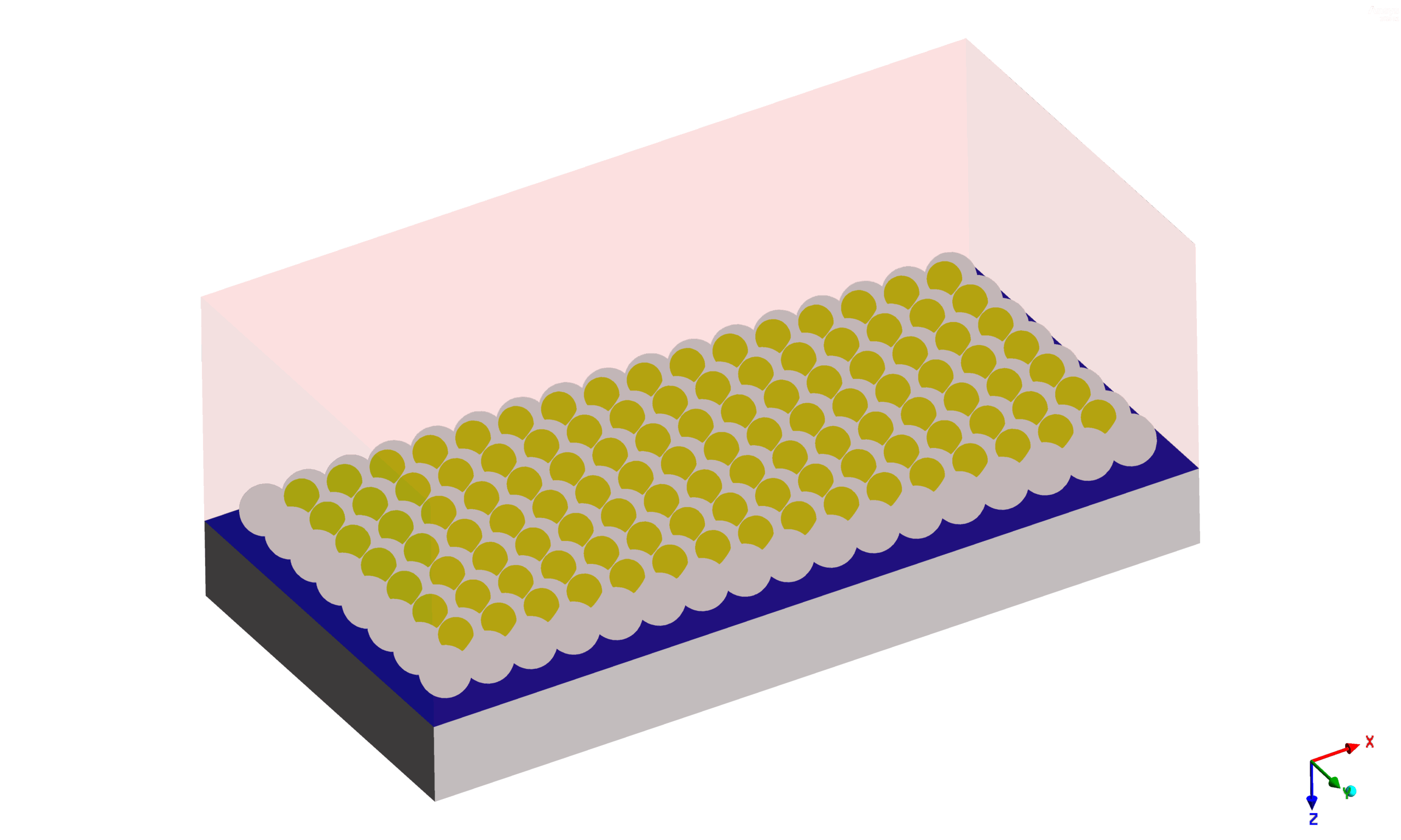 The computational domain was designed with dimensions of 1.0 × 0.5 × 0.4 mm, representing a microscale laser processing environment. The geometry consists of spherical particles arranged in a regular pattern on a multi-layered substrate, with particles composed of two different materials having distinct properties. The geometry was created using ANSYS Design Modeler, ensuring precise particle arrangement representation and substrate configuration representation.
