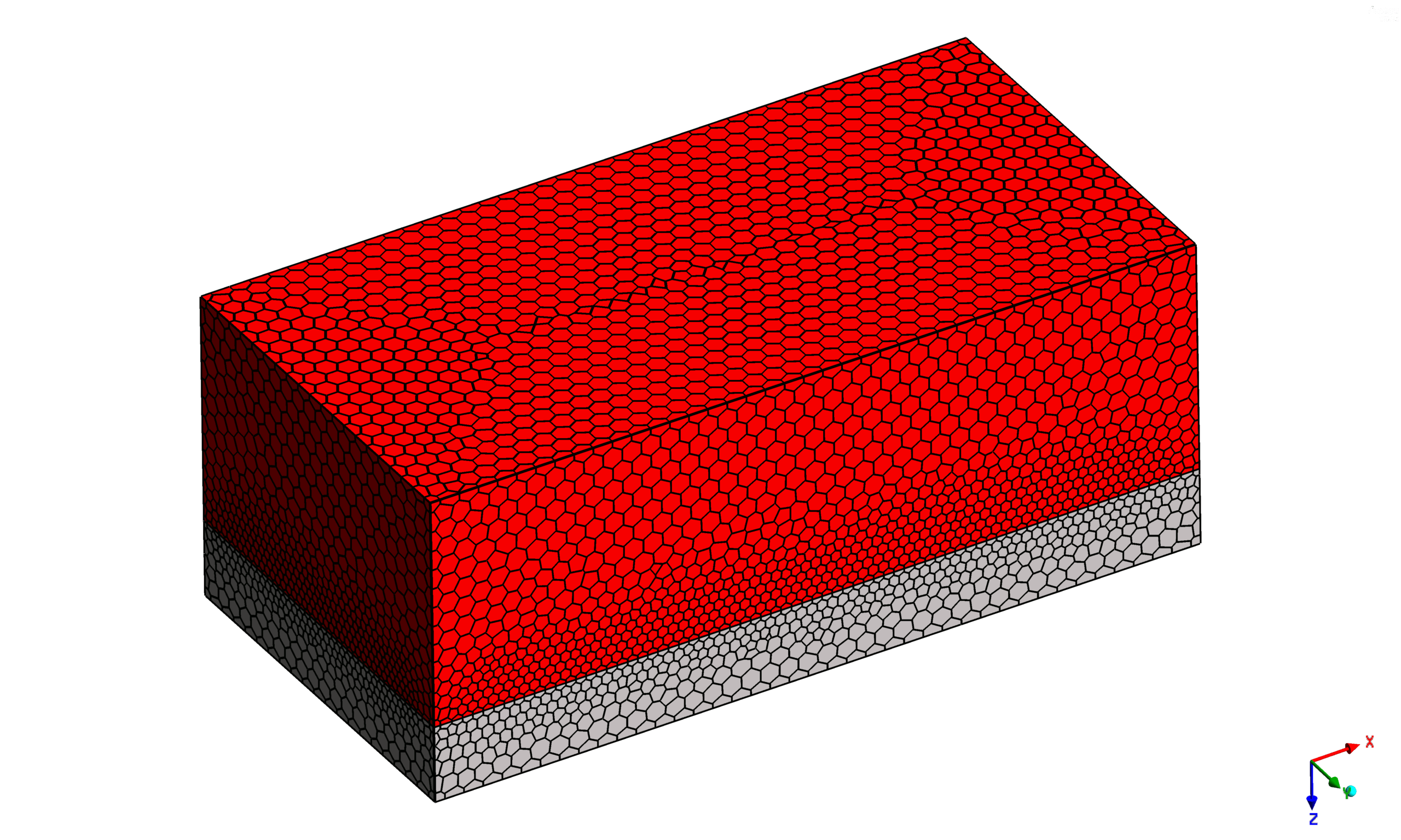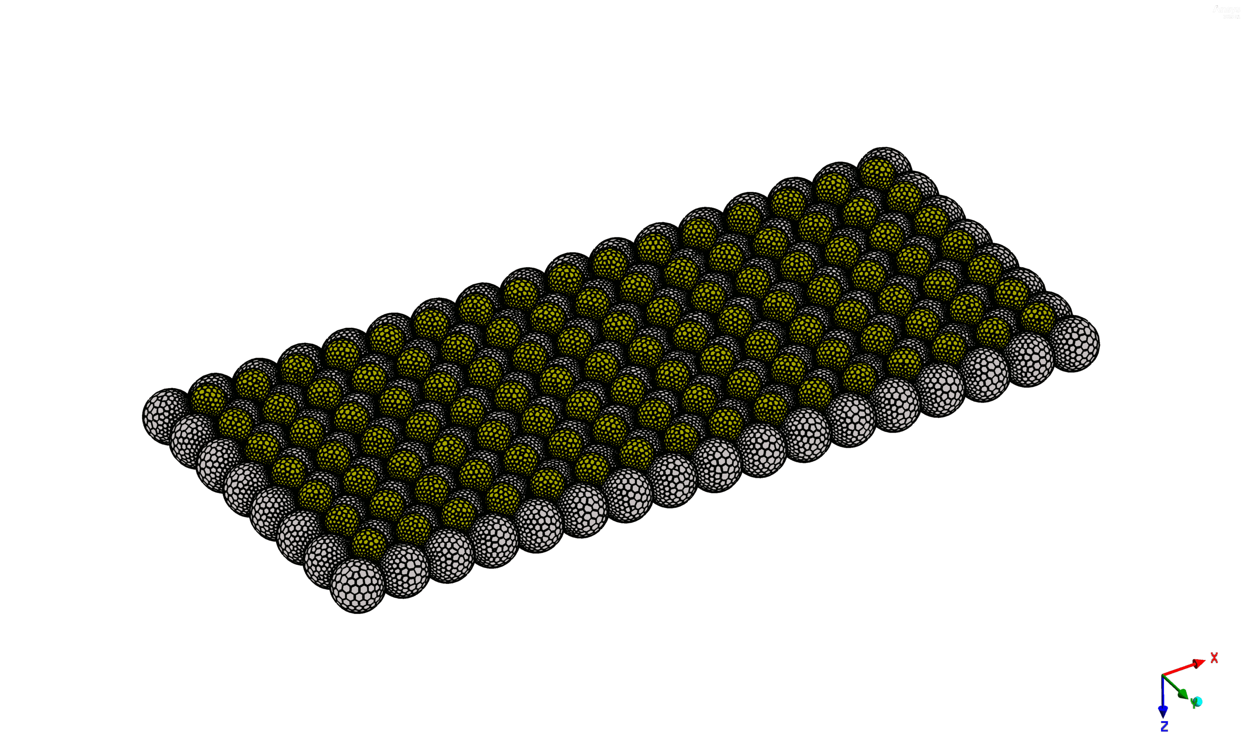 The mesh generation was performed using ANSYS Fluent Meshing, resulting in approximately 800,000 computational cells. The mesh was designed as an unstructured grid with refined regions around the particles to capture the thermal gradients and phase change phenomena accurately. Special attention was given to the coordinate system origin placement, significantly affecting UDF accuracy. The mesh quality was optimized to ensure proper resolution of the laser-material interaction zone while maintaining computational efficiency.