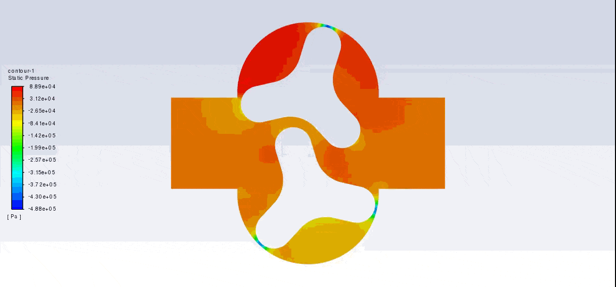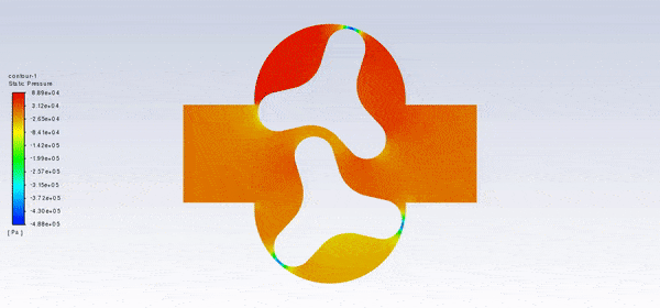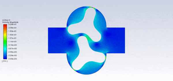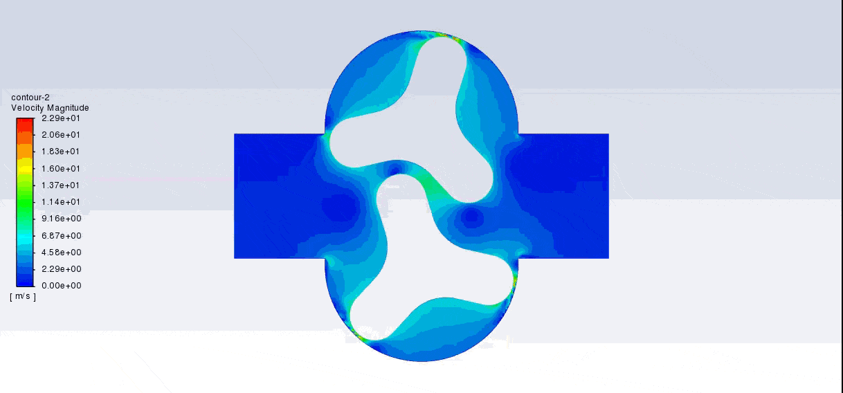 After the solution, we obtained pressure, velocity contours, and velocity vectors. Because the lobes rotate over time, we obtained the velocity and pressure contours and the velocity vector animation.