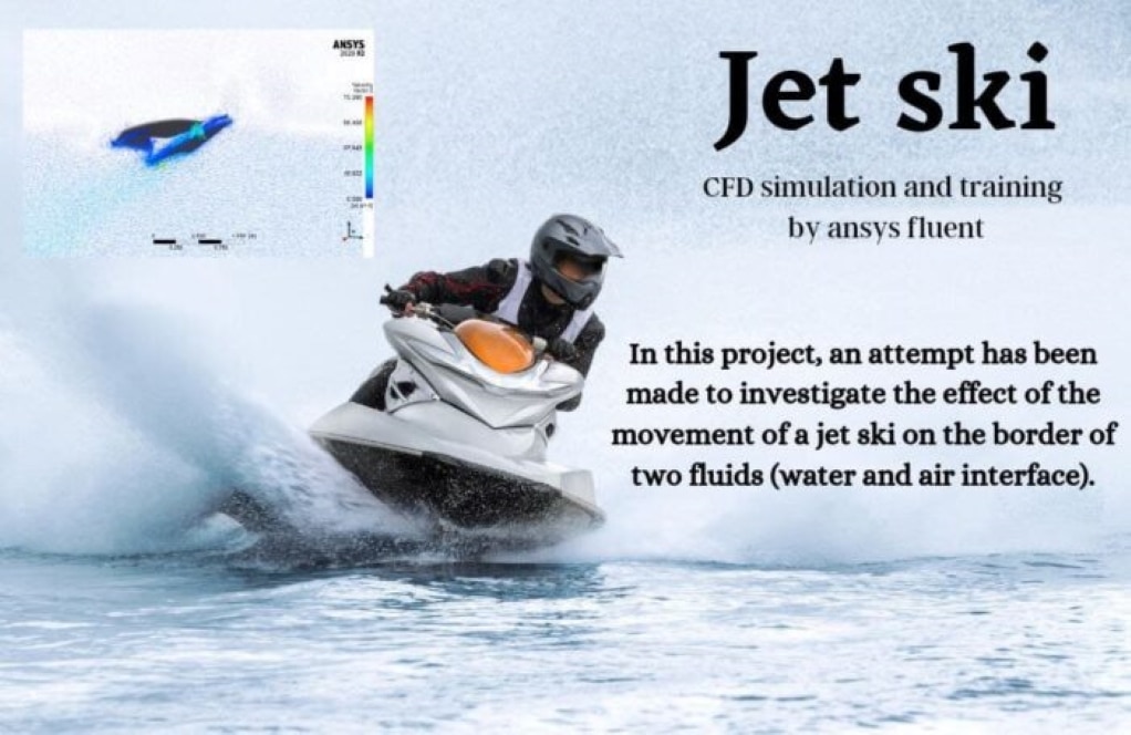 In project number 8, an attempt has been made to investigate the effect of the movement of a jet ski on the border of two fluids (water and air interface). The computational domain consists of an inlet wherein the water enters with a mass flow rate of 50000Kg/s and a pressure outlet. The multi-phase VOF model is activated for solving multi-phase flow equations and the standard k-epsilon model is exploited to account for the turbulence in fluid flows.
