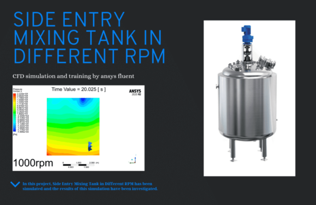 In practical exercise number 7, Side Entry Mixing Tank in Different RPM has been simulated. The mixing process is essential in many industries; for example, in the mechanical and also oil and gas industry. Water deposition causes much damage to storage tanks, which causes corrosion, leakage, and perforation of the source.
