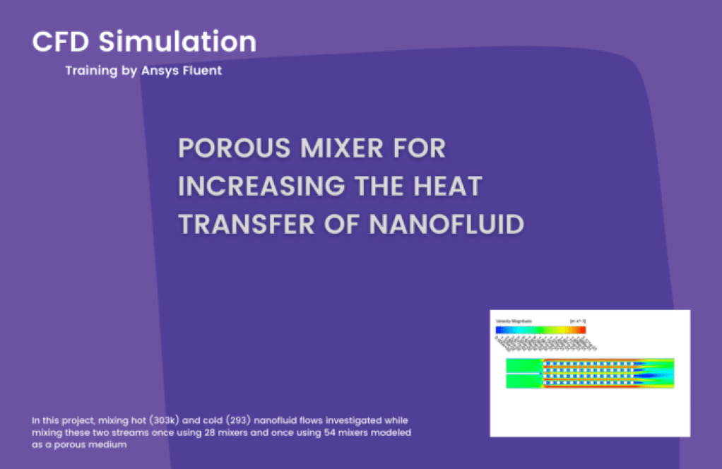 In project number 1, a Porous Mixer for Increasing the Heat Transfer of Nanofluid is simulated. mixing hot (303k) and cold (293) nanofluid flows were investigated while mixing these two streams once using 28 mixers and once using 54 mixers modeled as a porous medium.