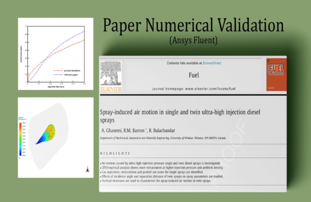 Problem number 9 simulates fuel injection through an injector into a chamber. This simulation is based on the information in the article “Spray-induced air motion in single and twin ultra-high injection diesel sprays” and its results are compared and validated with the results in the article. The fuel used in this model is diesel and its properties include density equal to 830 kg.m-3, specific heat capacity equal to 1680 j.kg-1.K-1, droplet surface strain equal to 0.0255 nm -1 and the viscosity is equal to 0.0027888 kg.m-1.s-1. Finally, practical exercise number 10 simulates the water vapor flow inside a steam ejector. This numerical simulation is based on the reference paper “CFD simulation on the effect of primary nozzle geometries for a steam ejector in refrigeration cycle” and the results of the present numerical work are compared and validated with the results in the reference article. An ejector is a mechanical device that uses an actuator fluid to suck a secondary material (gas, liquid, or solid particles), and finally, the actuator fluid and the suction substance are mixed together and exit from the system.