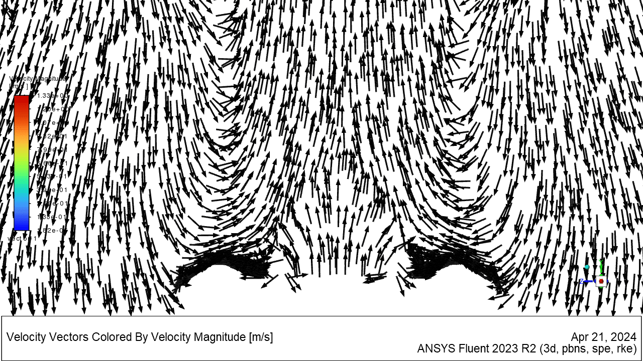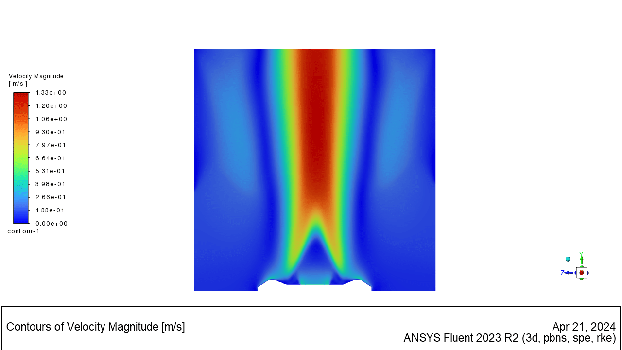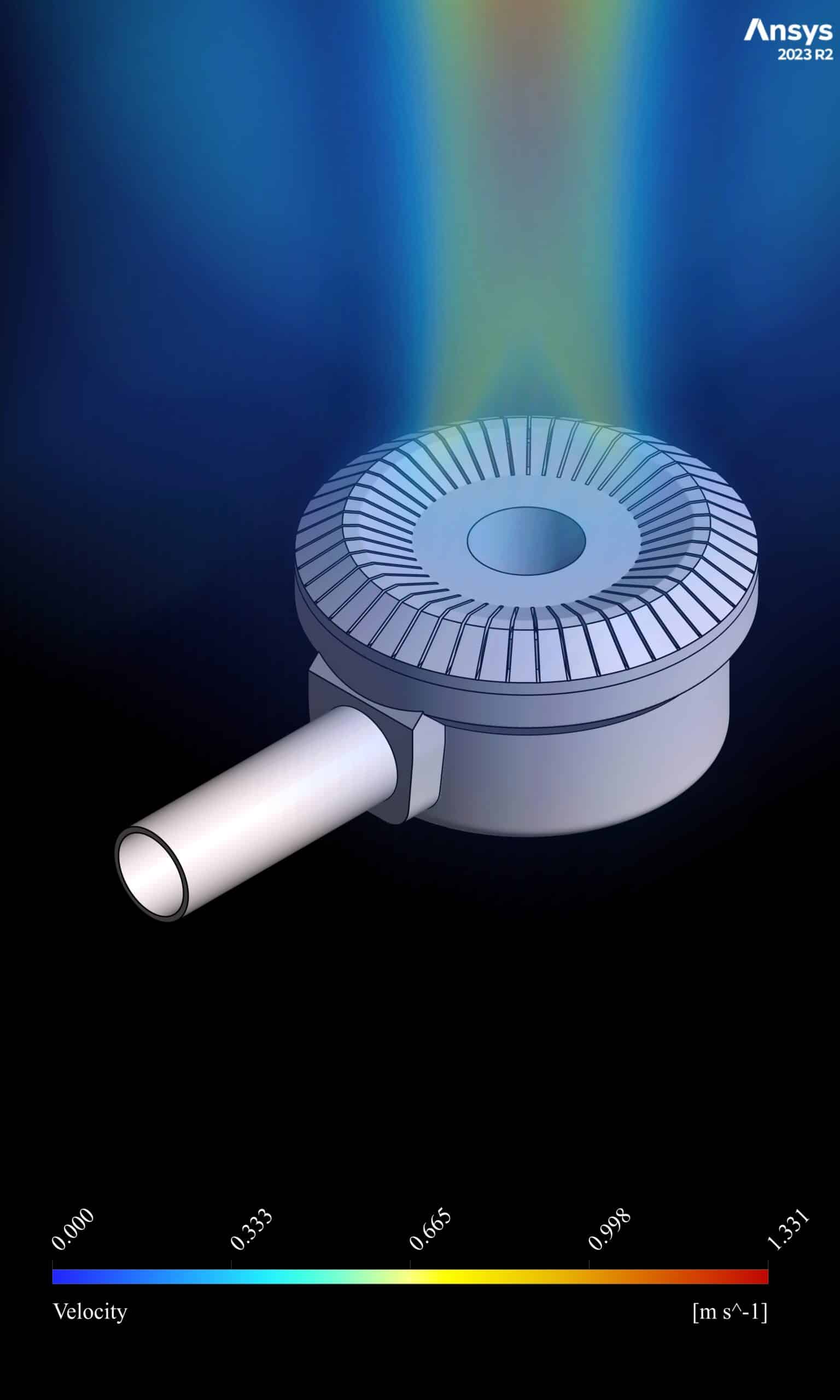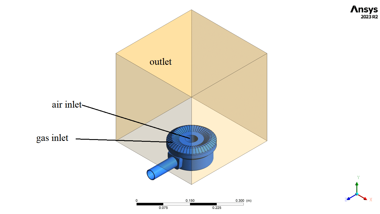 The gas stove is modeled in 3D. The fuel velocity at the inlet is set at 0.03 m/s, and the ambient temperature is specified as 300K. The air inlet boundary condition is defined as a ‘Pressure Inlet‘, which allows air to flow into the domain naturally due to the pressure difference.