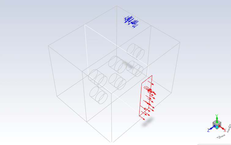Since in this process proper airflow is essential, installing exhaust fans to circulate air and remove heat has been considered. The source term with 186,390.38 [W/m3] generated heat by the miners is defined as energy source in cell zone conditions for the fans, which means the fans are supposed to move this heat as a kind of ventilation.