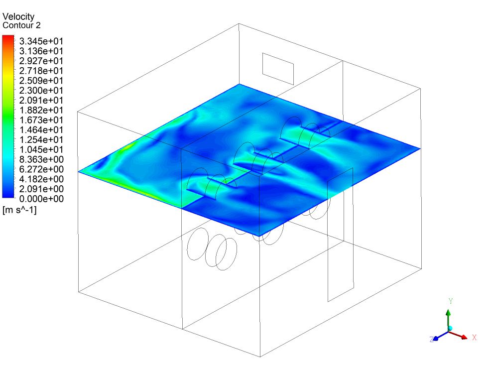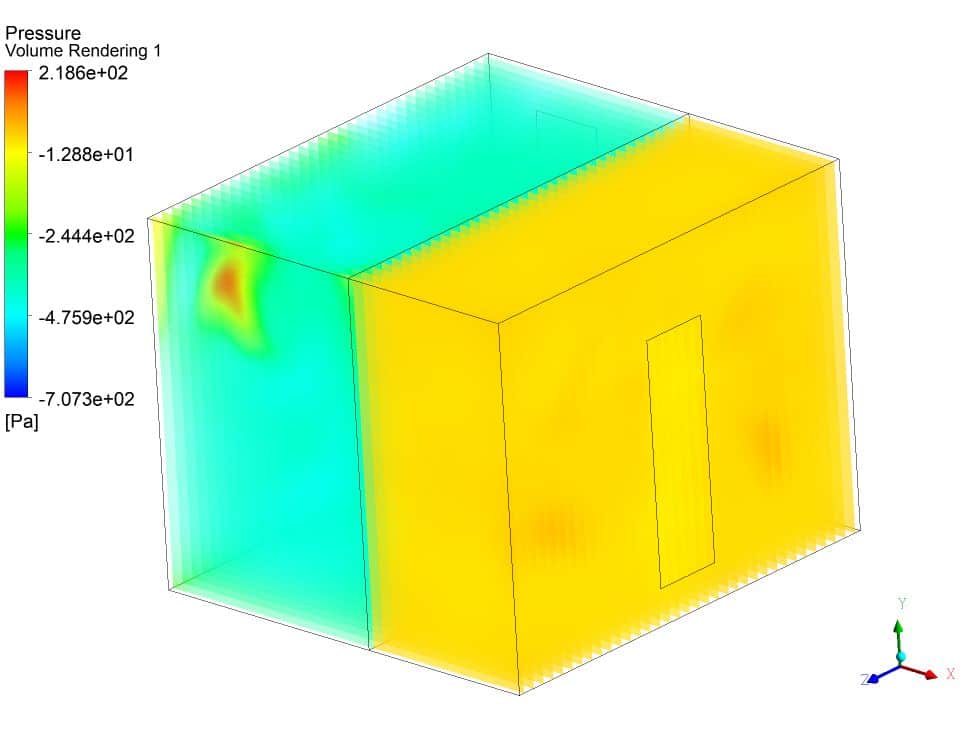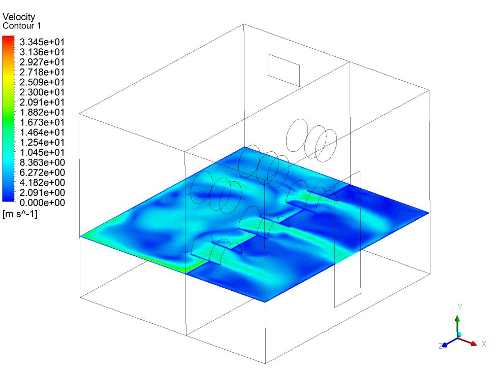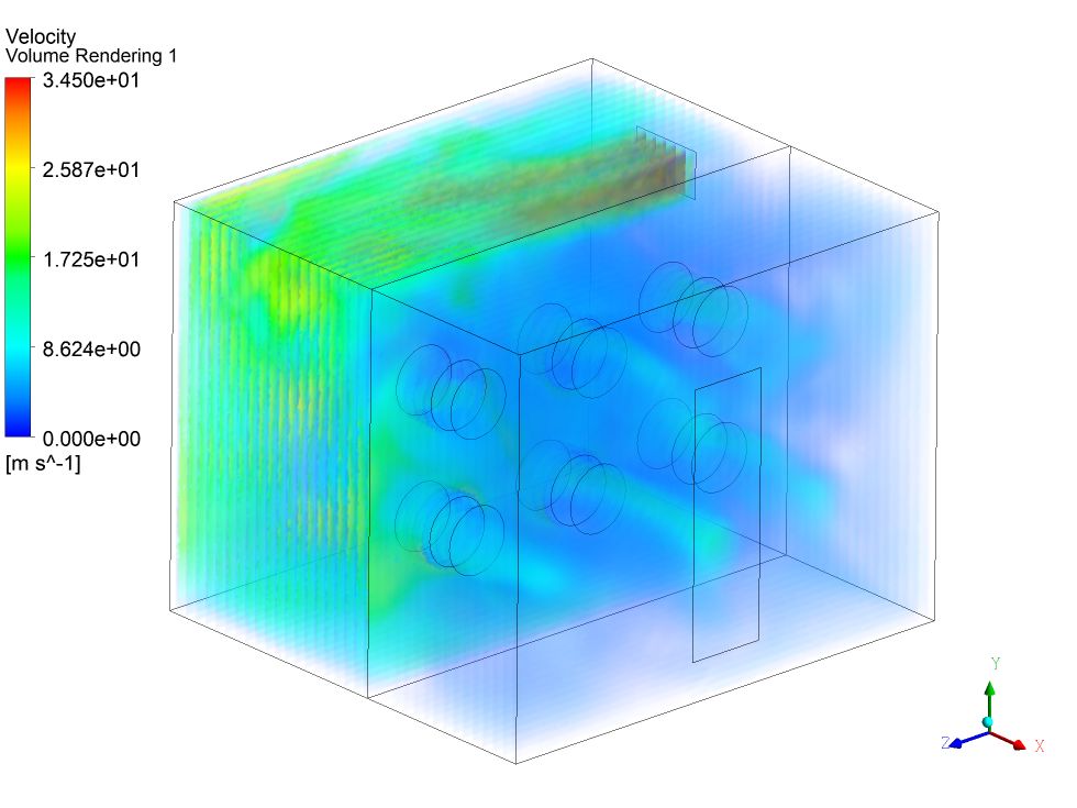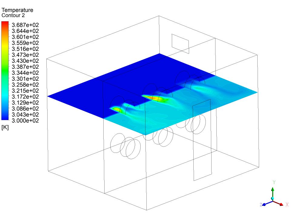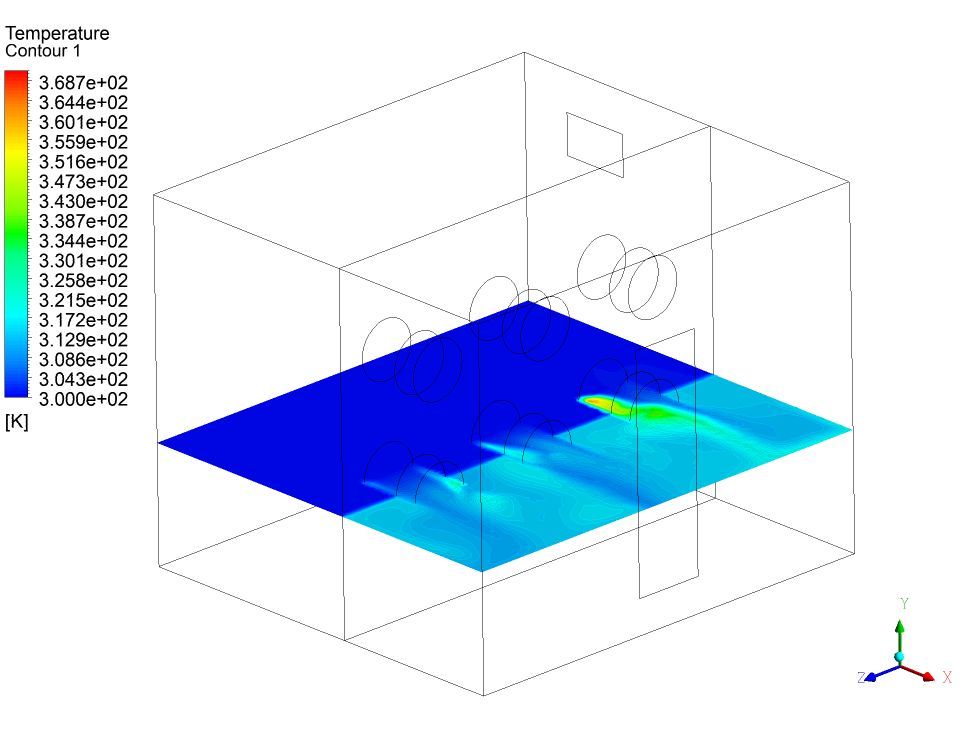 The obtained contours clearly show how the hot air moves from the big to small room indicating the circulation and ventilation of the flow. For instance the volume rendering of the temperature shows the high temperature in the fans and low temperature in the big room cause of transferring the heat to the next room.
