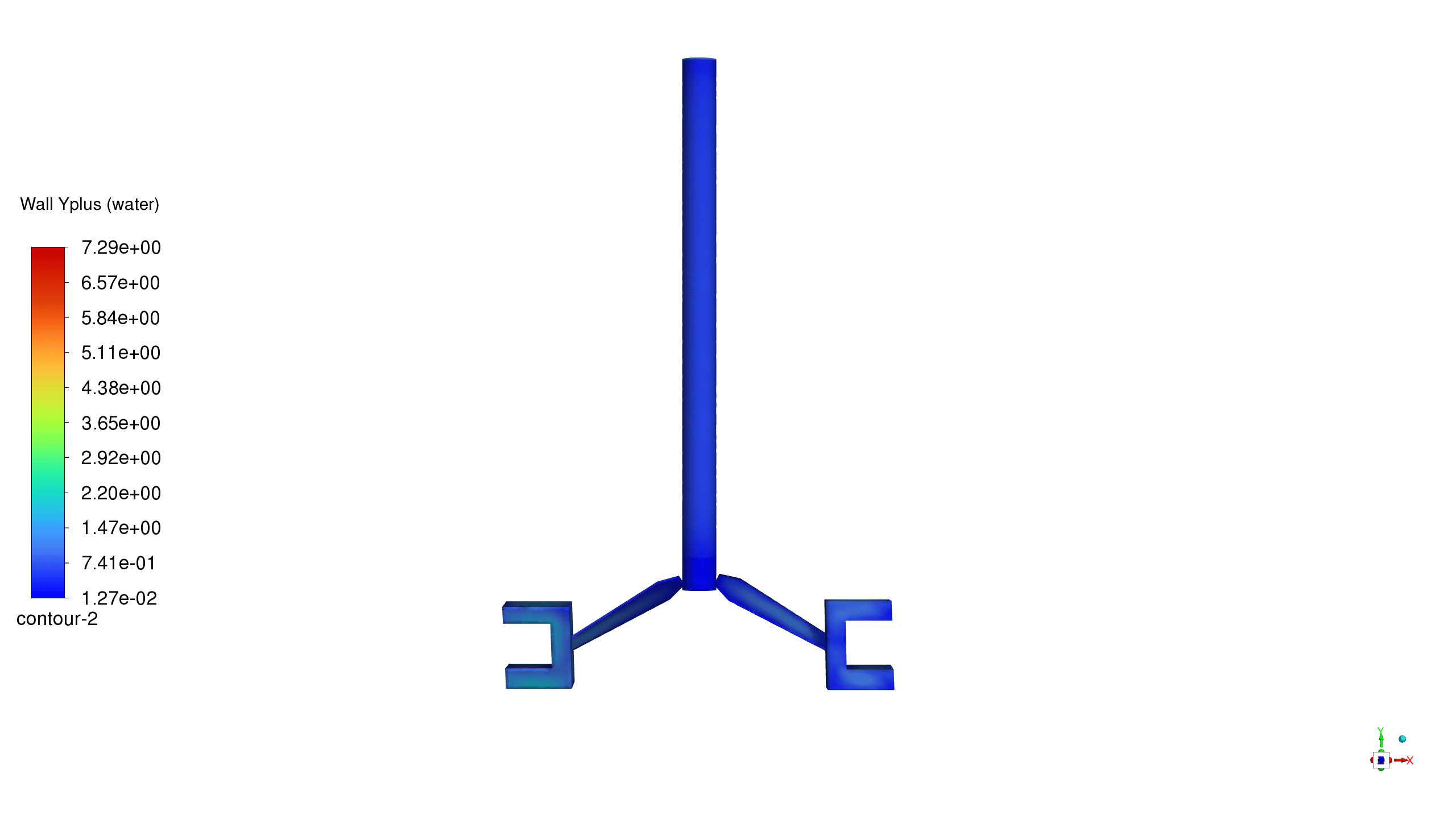 - From the y+ contours, it is evident that the y+ values of the rotating components (shaft and impeller) are approximately in the range of 0 to 7.3. This indicates that the chosen wall function is functioning correctly, with the y+ values falling within the acceptable range for its application.