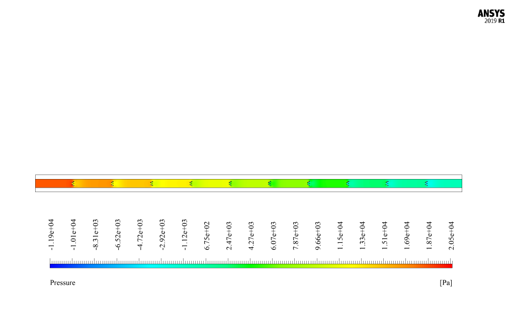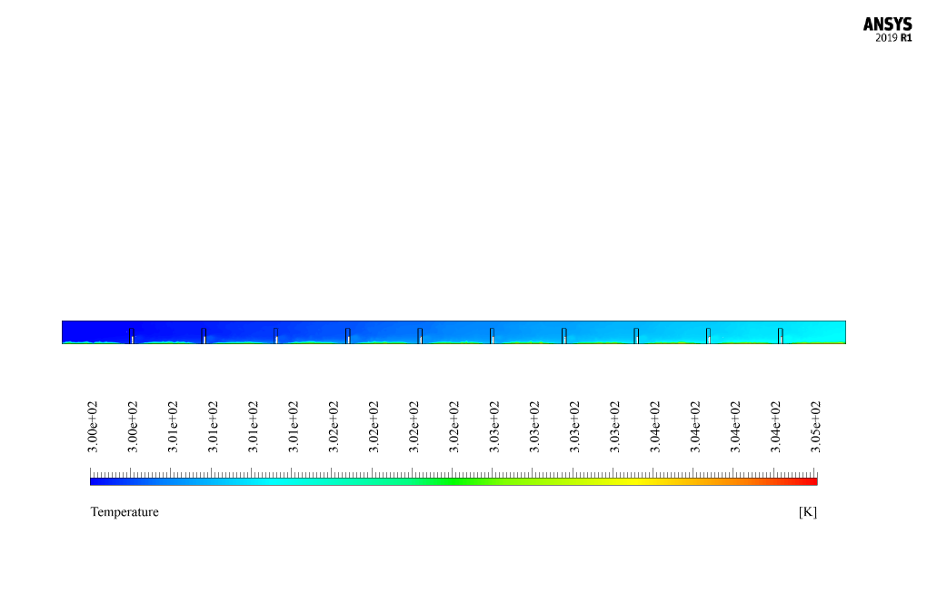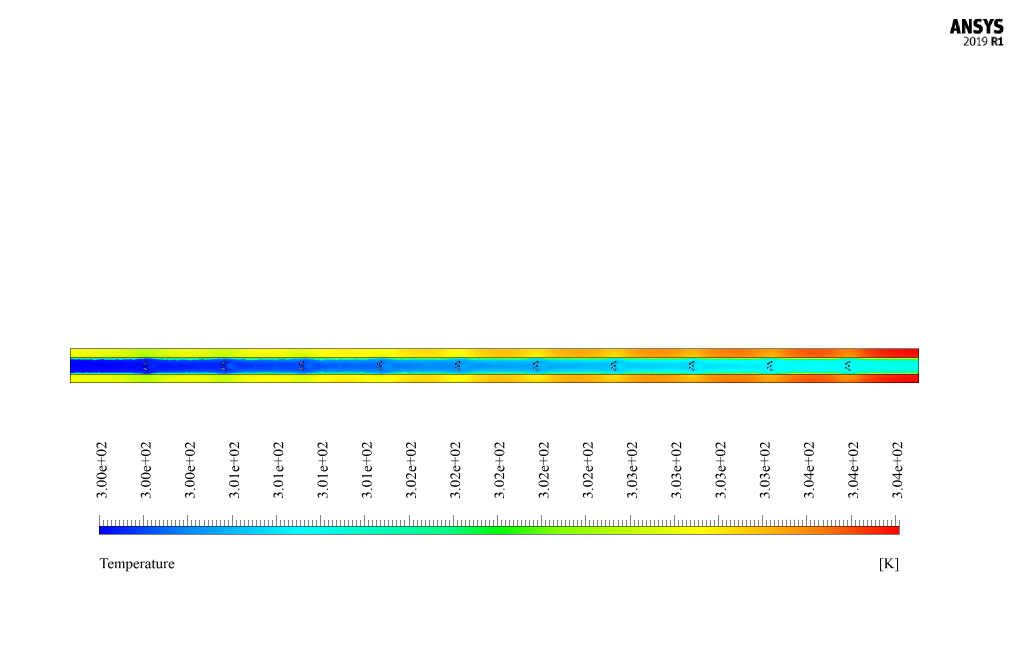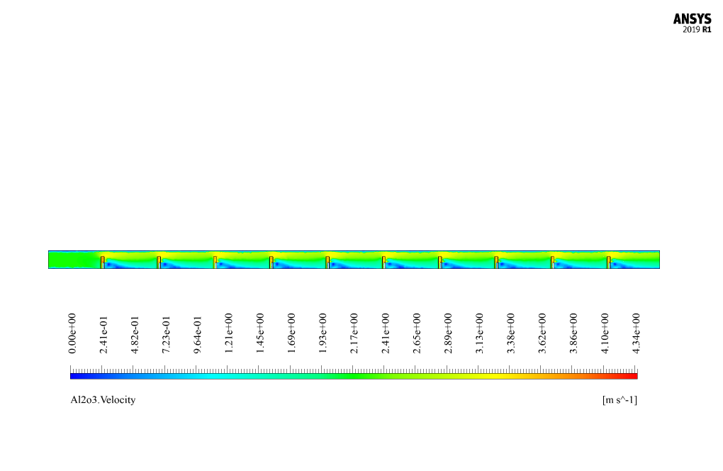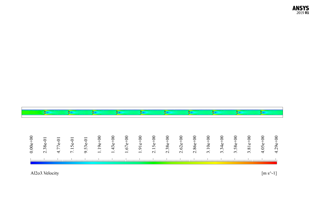 The introduction of Al2O3 nanoparticles into the fluid increases the thermal conductivity of the nanofluid compared to the base fluid, which is water in this case. The increased thermal conductivity leads to a more efficient and enhanced heat transfer from the heat source to the fluid, improving the system’s thermal performance. In this simulation, including aluminum oxide nanoparticles results in a significant improvement in heat transfer efficiency within the channel.