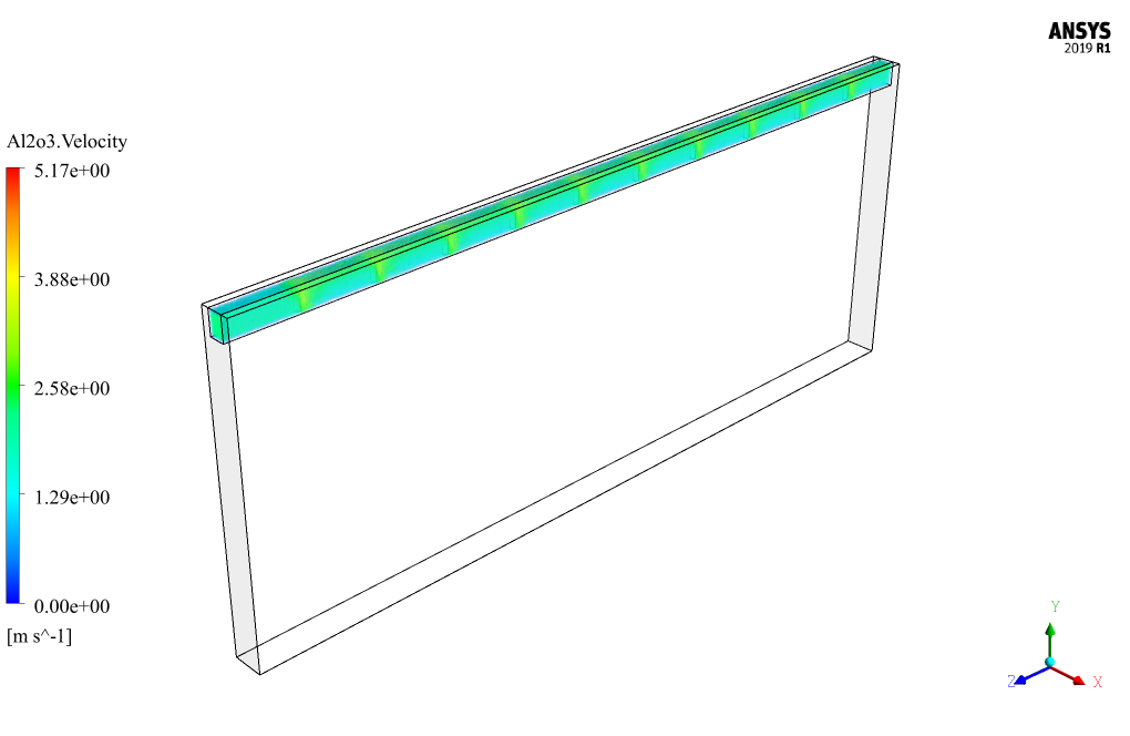 Aluminum oxide (Al2O3) is introduced as a dispersed solid phase within a continuous fluid (water) in the simulation. Using the mixture multiphase model in ANSYS Fluent manages the interaction between the two, treating the nanoparticles as a secondary ‘pseudofluid’ due to their small size and dispersion in the primary fluid.