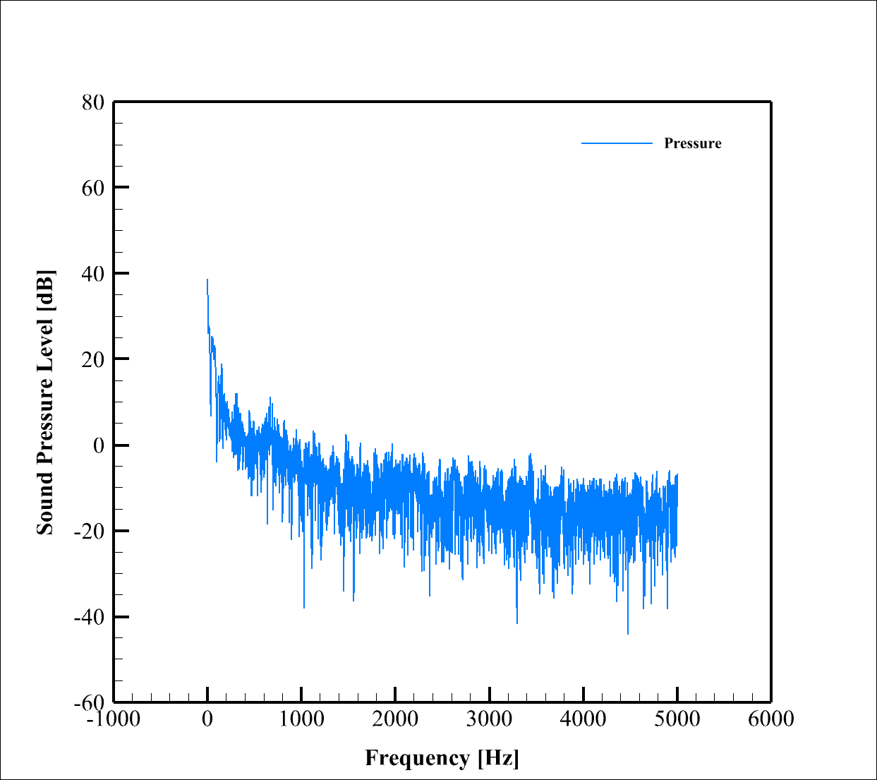 SPL (Sound Pressure Level) graph is obtained by applying a Fourier transform (FFT) to the time domain signal and shows the noise characteristics in the frequency domain. No frequency filtering is applied here. The graph starts with a relatively high level at low frequencies (about -17 dB at frequencies near zero) and then decreases slowly and uniformly with increasing frequency, reaching about -40 dB at 5000 Hz.