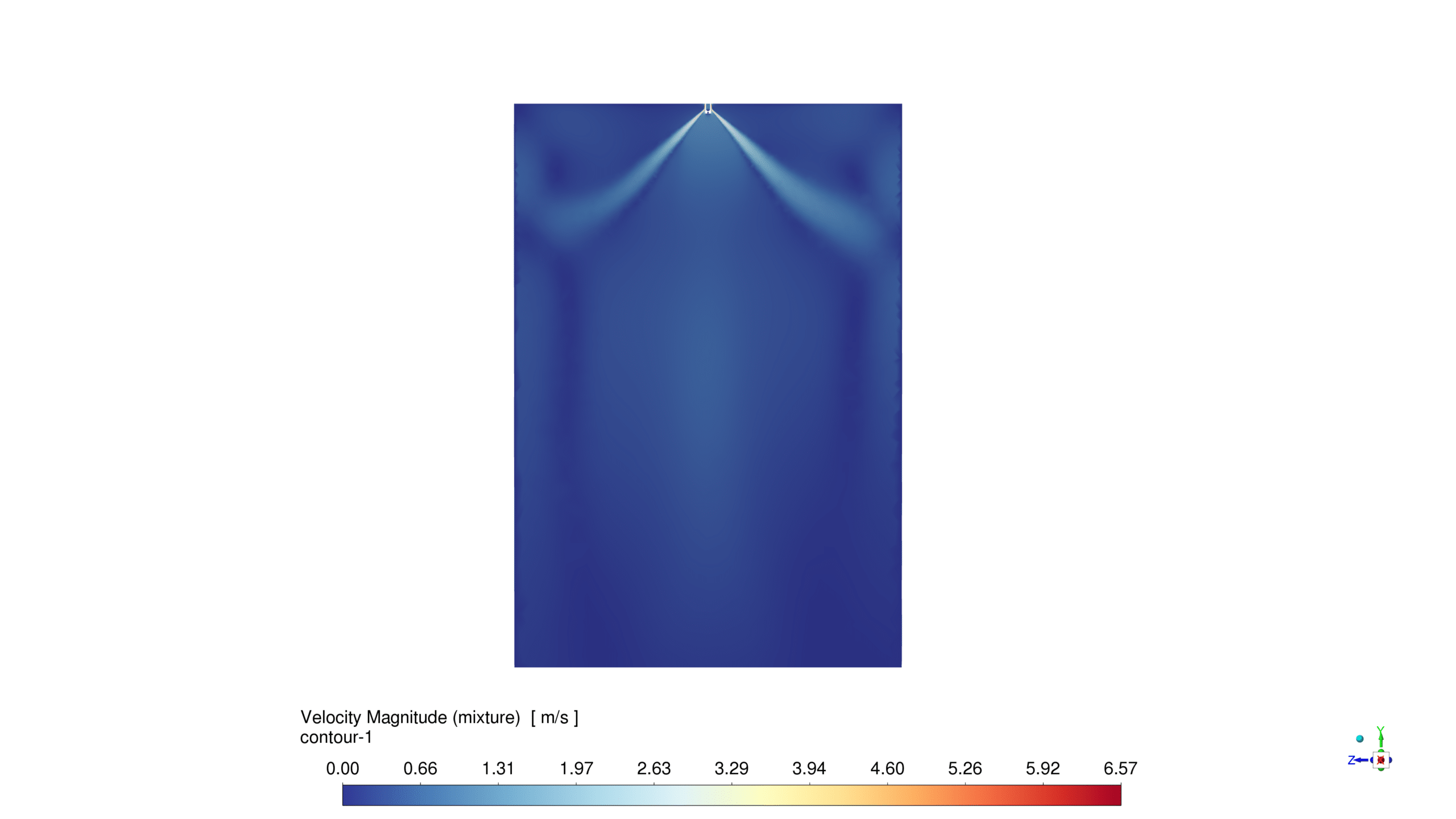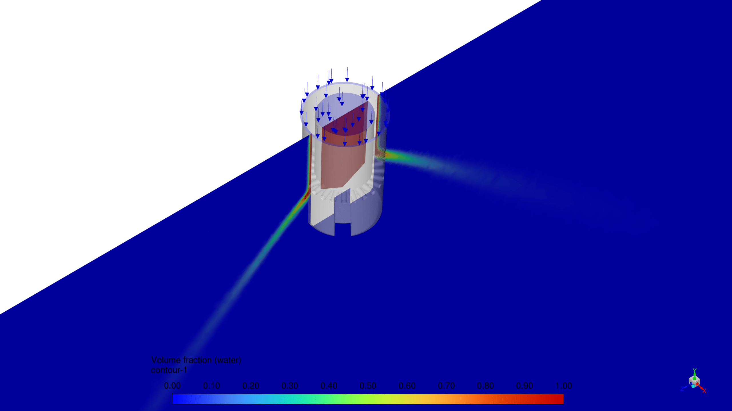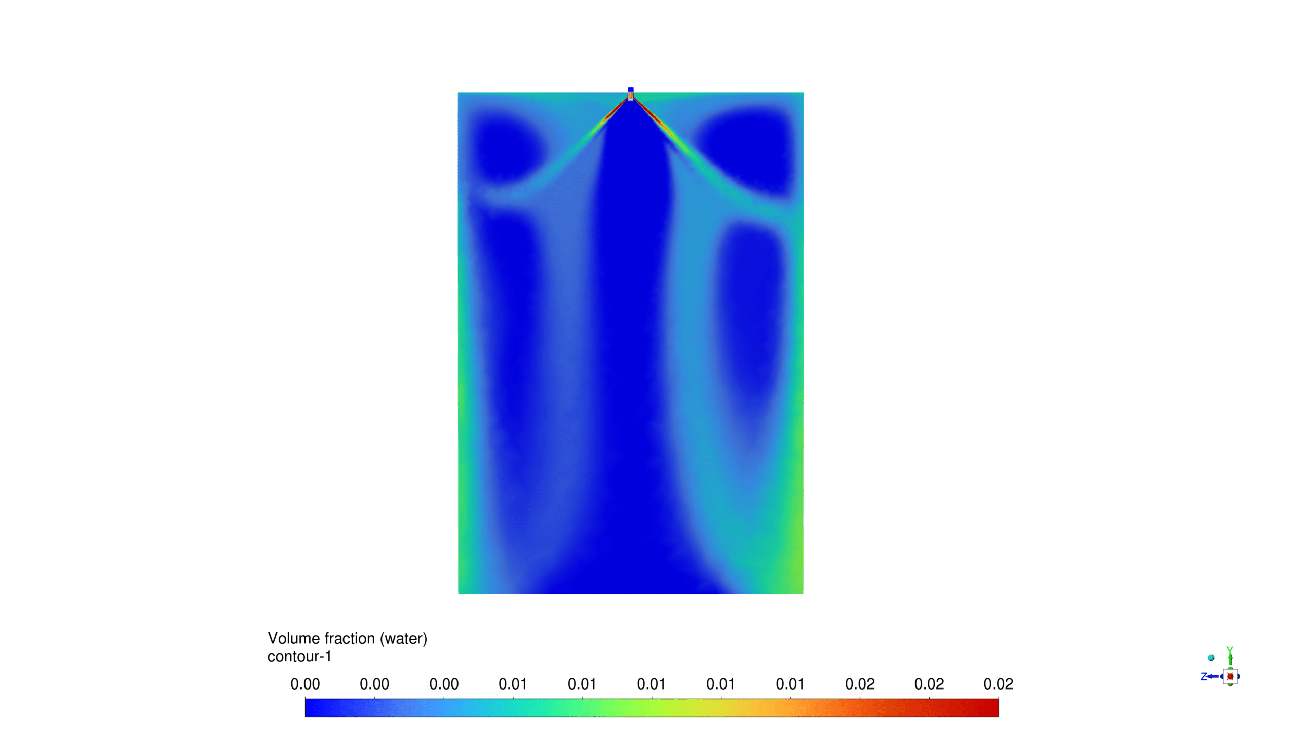 The water volume fraction contours clearly illustrate the spray pattern from the top injection point, with the liquid phase (red-orange areas) spreading radially outward, confirming the distributor’s effectiveness in achieving uniform liquid distribution.