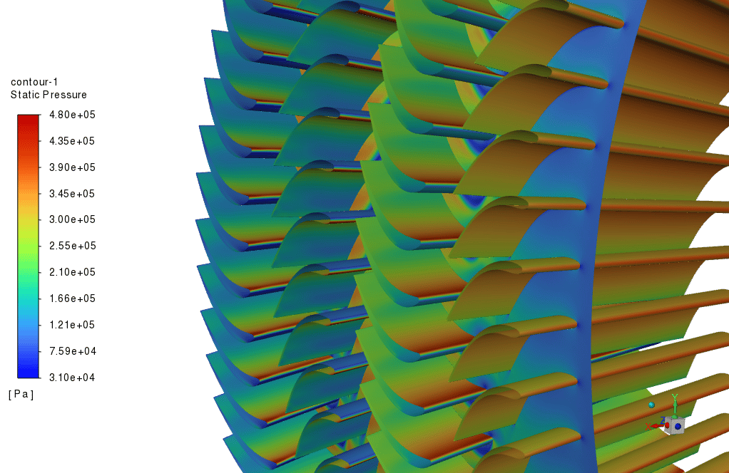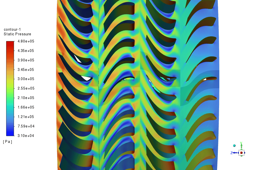 In this simulation, the pressure-based solver has been used. For modeling turbulence, the k-omega SST model was used, which simulates the compressor at the operational point with a mass flow rate of 520 kg/s.