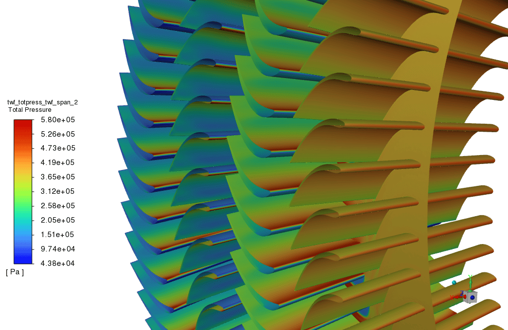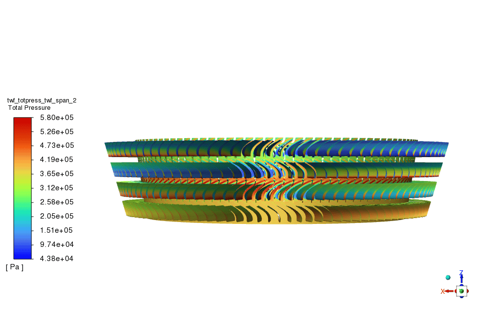 The compressor motion has been modeled with the MRF method, each stage rotates at the speed of 6000 rpm. Also, the Turbo Workflow module was used to model the turbine.