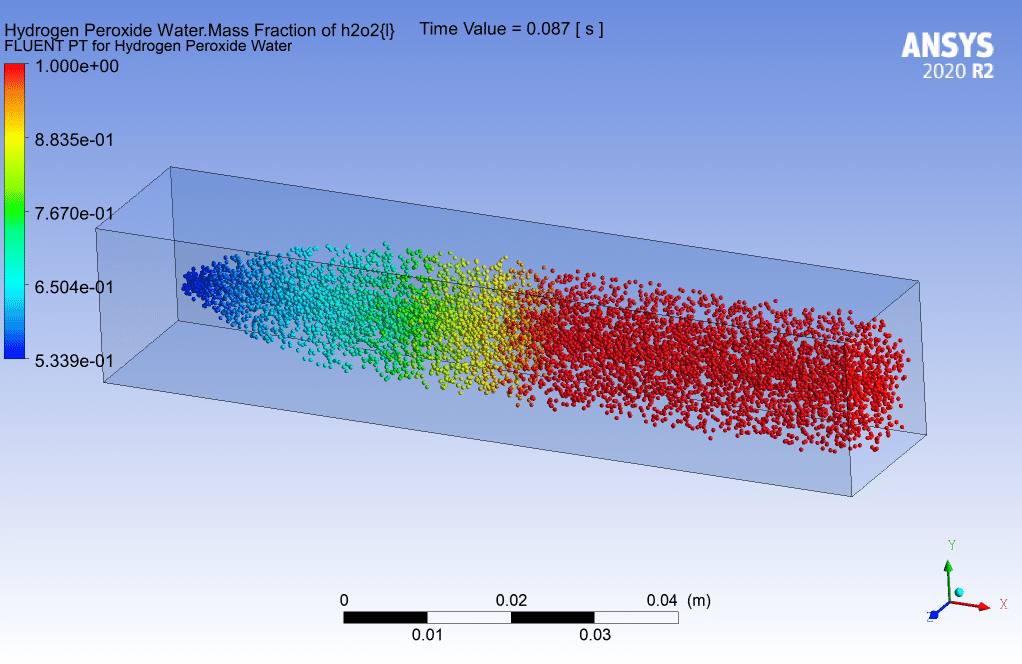 Ansys Fluent tracks the droplets through the domain and applies mass and heat transfer calculations based on local conditions on the progress of evaporation. Depending on the properties of the species involved (like water and hydroperoxide in this study), Fluent uses species transport and phase change models to predict the rates of evaporation for each component of the droplet.