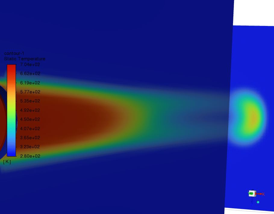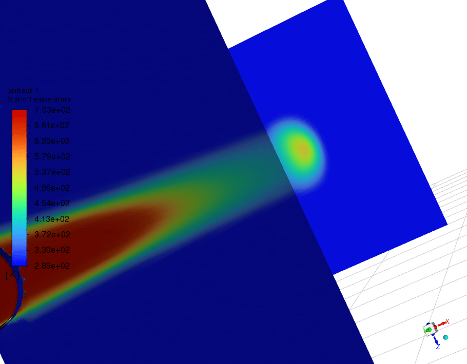 Contours of temperature and Acoustic Power Level (dB) are presented. At the plate 9 meters downstream from the nozzle, the area-averaged acoustic power level generated by jet exhaust in two cases is calculated: for the regular nozzle, it’s value is 8.32658 dB, and for the chevron nozzle, it’s value is 6.1478 dB. Therefore, this simulation shows that the chevron nozzle generates approximately 25 percent less noise.