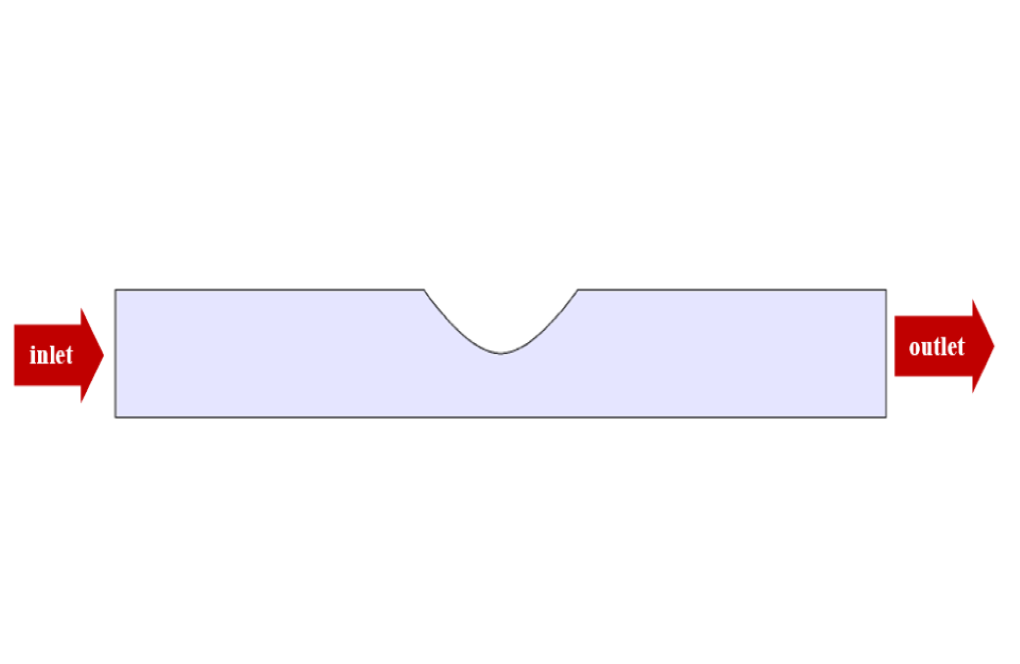 The present model is designed in two dimensions using Design Modeler software. The model is designed as a symmetrical part of a three-dimensional model that includes an inlet and an outlet and a recessed wall.