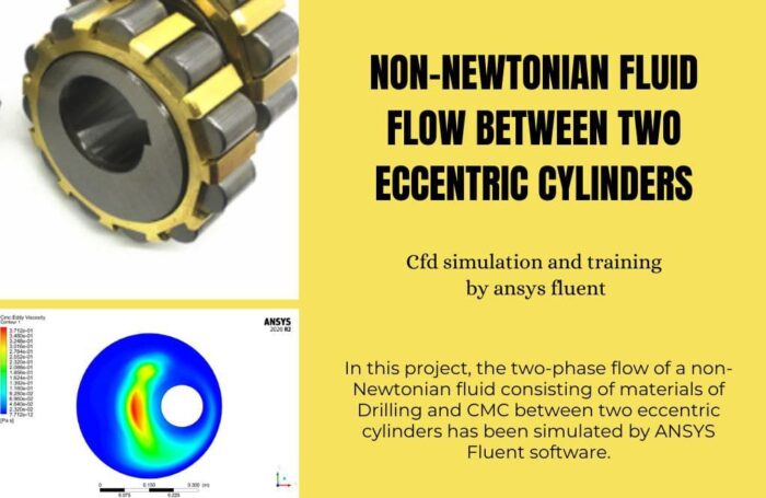 A non-Newtonian fluid is a fluid that does not follow Newton’s law of viscosity, i.e., constant viscosity independent of stress. In non-Newtonian fluids, viscosity can change when under force to either more liquid or more solid. Ketchup, for example, becomes runnier when shaken and is thus a non-Newtonian fluid. Many salt solutions and molten polymers are non-Newtonian fluids, as are many commonly found substances such as custard, honey, toothpaste, starch suspensions, corn starch, paint, blood, melted butter, and shampoo. In this project, ANSYS Fluent software has simulated the two-phase flow of a non-Newtonian fluid consisting of materials of Drilling and CMC between two eccentric cylinders. The geometry of this model consists of two eccentric cylinders and is designed and meshed in Gambit. The mesh type used for this geometry is structured, and the element number is 179,820.