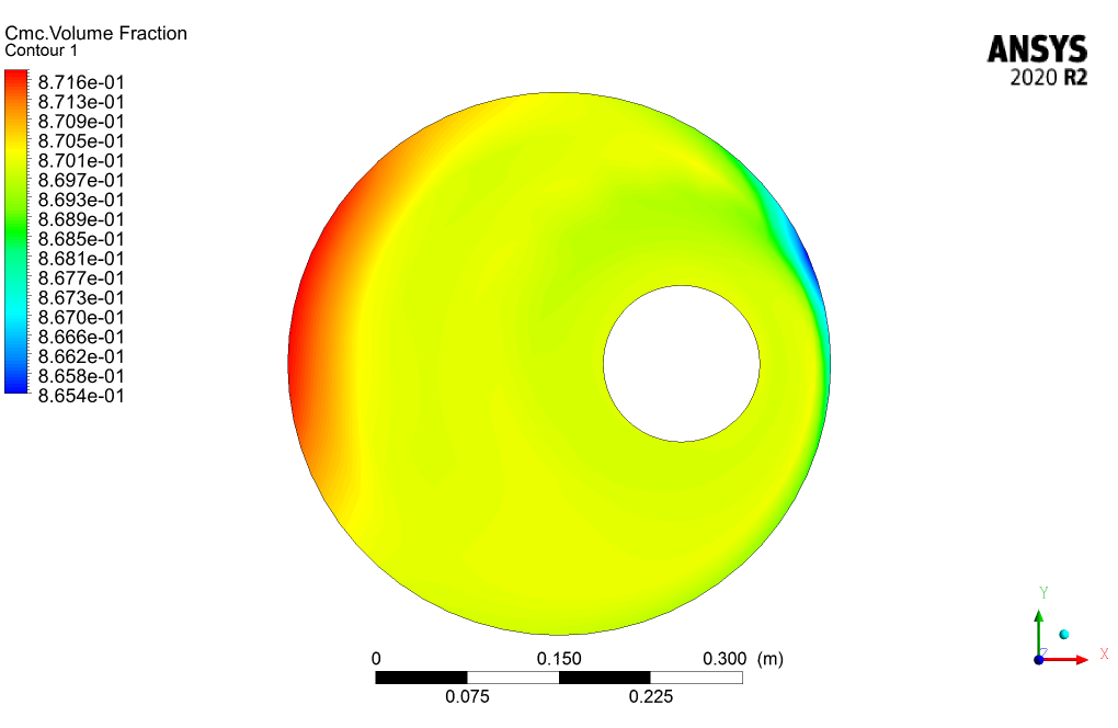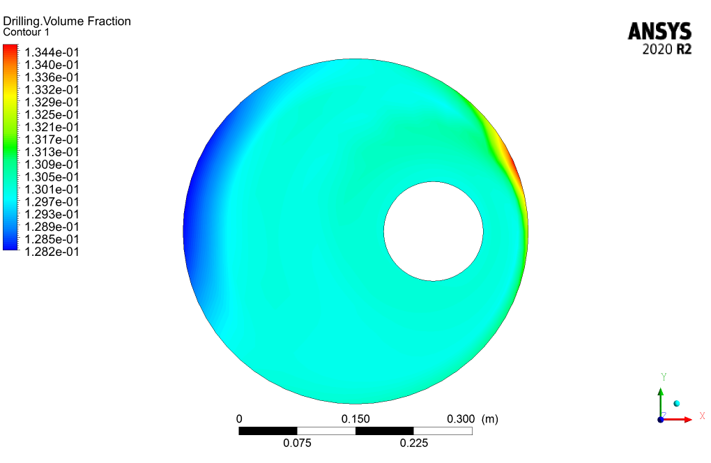 The standard k-omega model is used for flow analysis, and low-Re correction is activated to capture the flow patterns better. The Eulerian multiphase model for two phases of Drilling and CMC has been used to investigate the phase interactions of the non-Newtonian fluid. The mixture of these two fluids will enter the space between the eccentric cylinders with a velocity of 0.25m/s, and the inner cylinder will start to rotate by applying the Moving Wall option.