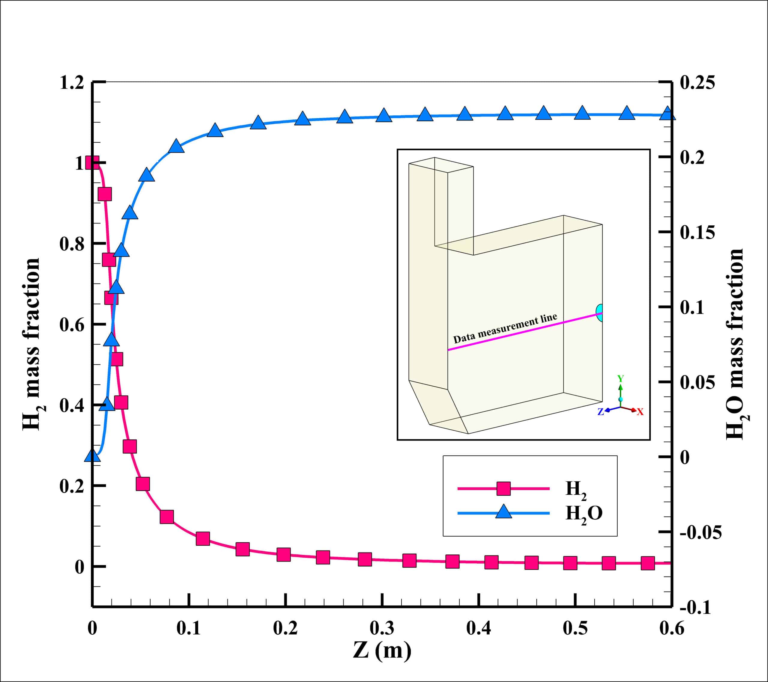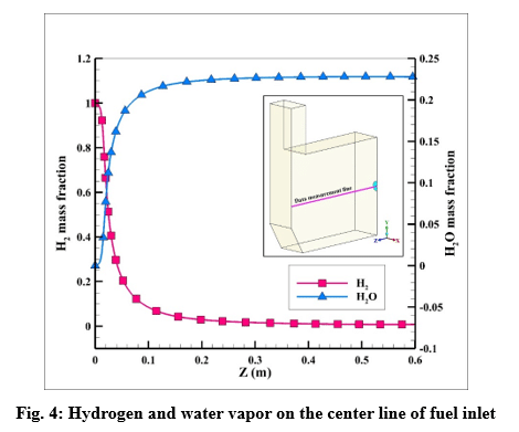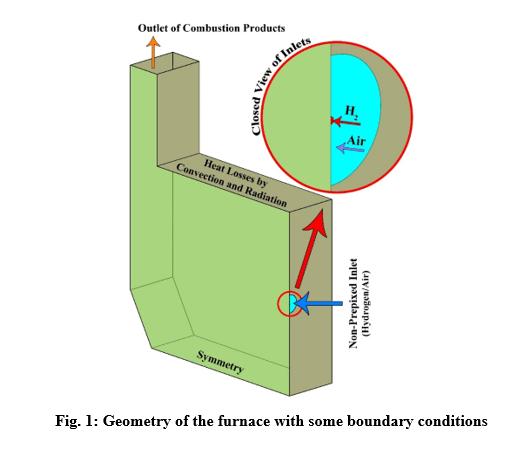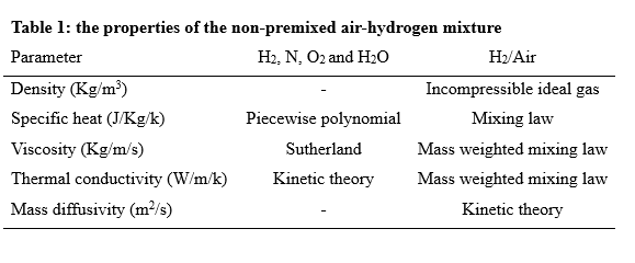 The simulations are conducted in such a way that a non-premixed air-hydrogen mixture, with an equivalence ratio of 1, enters the furnace, and after the chemical reactions are completed, the combustion products are depletion to the atmosphere at the outlet. In this way, the properties of the non-premixed mixture, which is modeled by species transport, are given in the table 1.