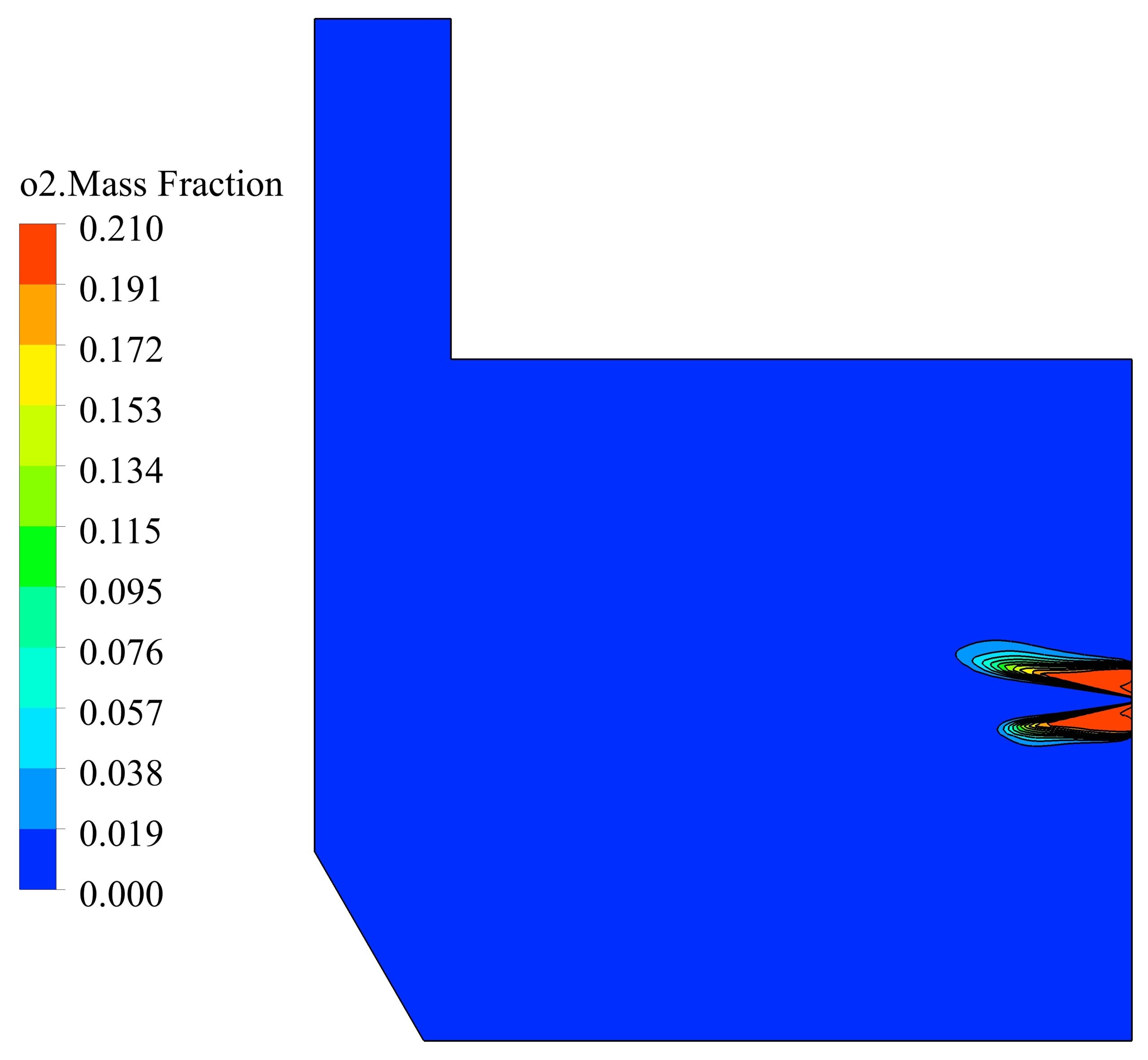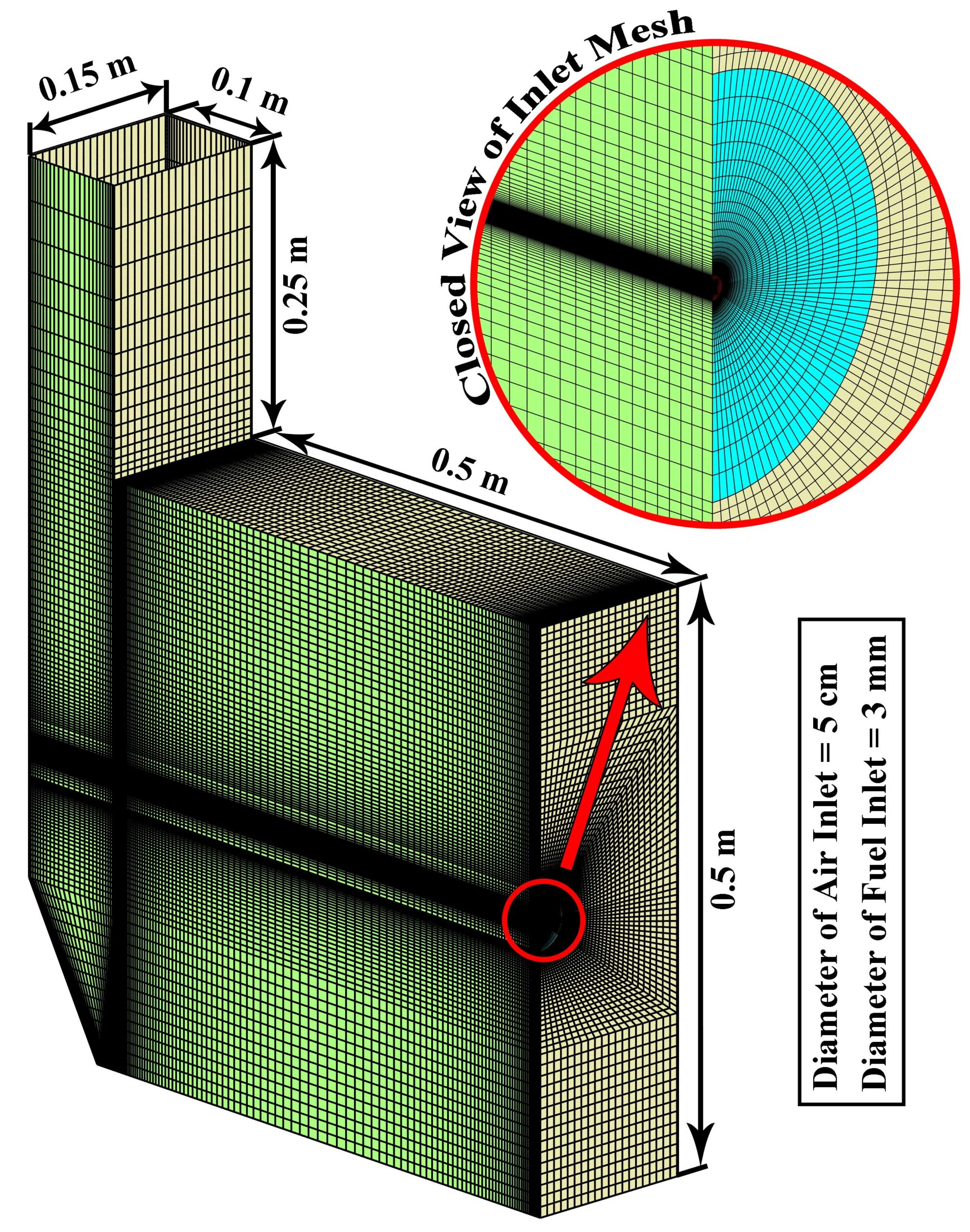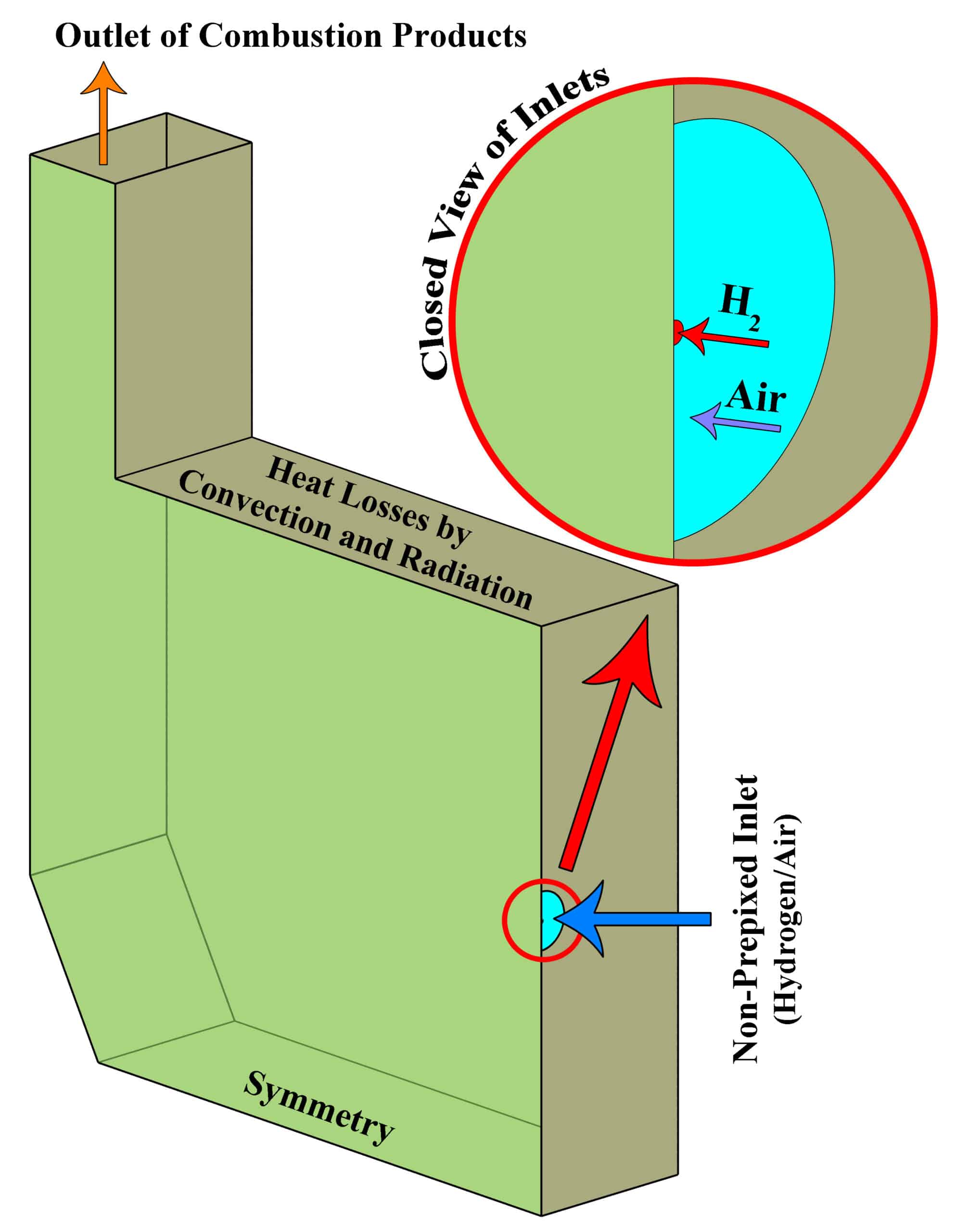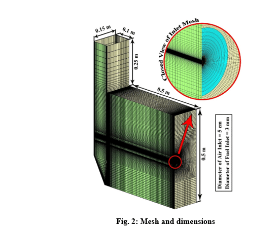The design of a furnace with separate inlets of fuel and air is shown in the fig. 1. Inlet mass flow rate is set for hydrogen and air inlet, and for the outlet, the boundary condition of the outlet pressure and depletion to the atmosphere is considered. The mass flow rate is set to 0.01 Kg/s for air, and 0.0003 Kg/s for hydrogen, in which case the equivalence ratio is equal to 1. The boundary conditions of the side walls are all of the type of heat loss with the outside environment through convection and radiation (With the heat transfer coefficient of 16 W/m2/K, the ambient temperature is 300 K and the sky temperature is 271.2 K). Also, a thickness of 5 cm of shell condition type and steel metal is considered for the side walls.
