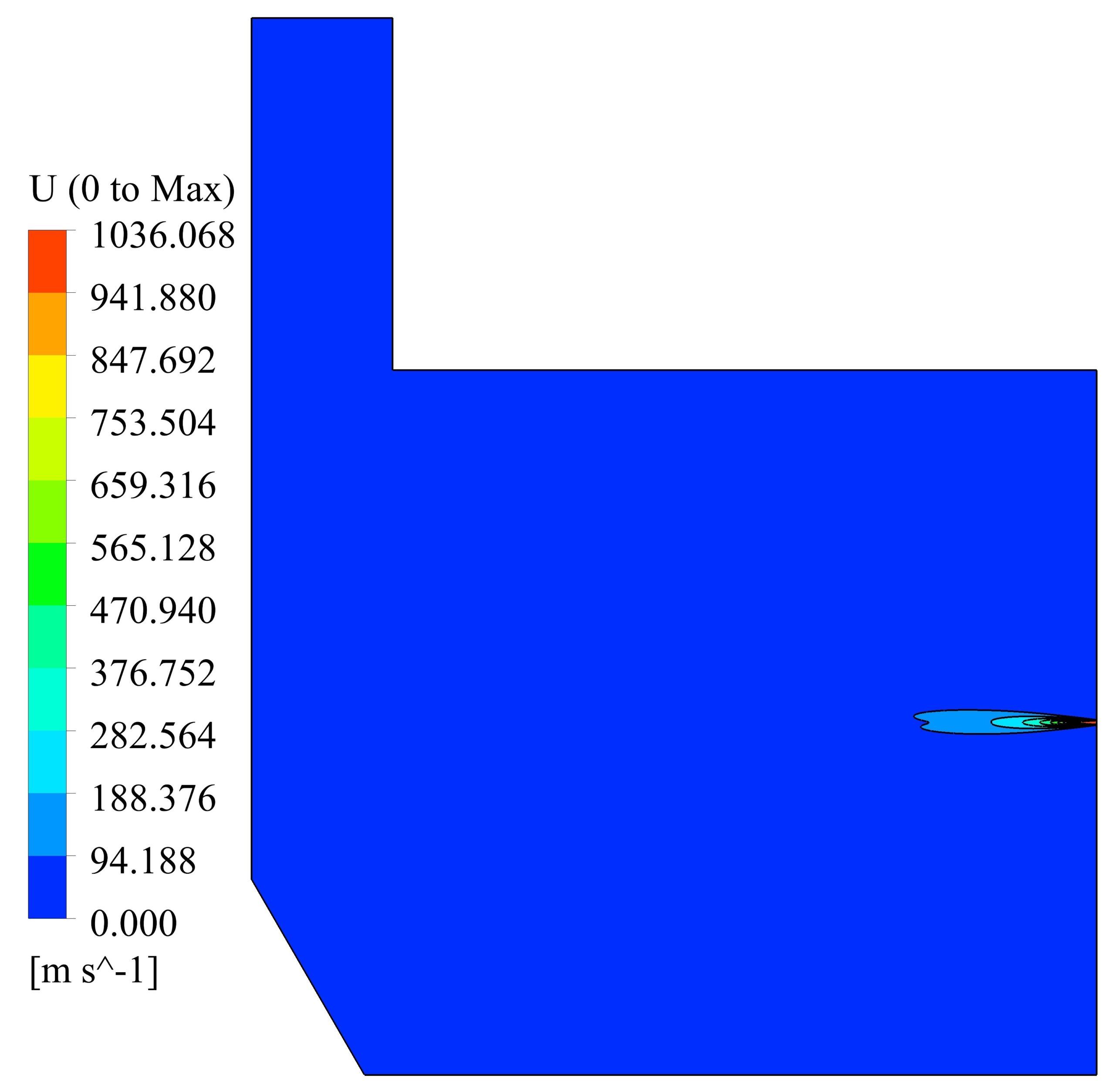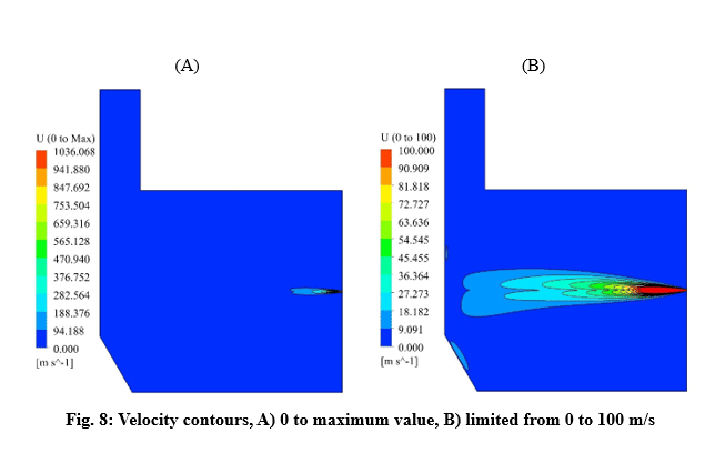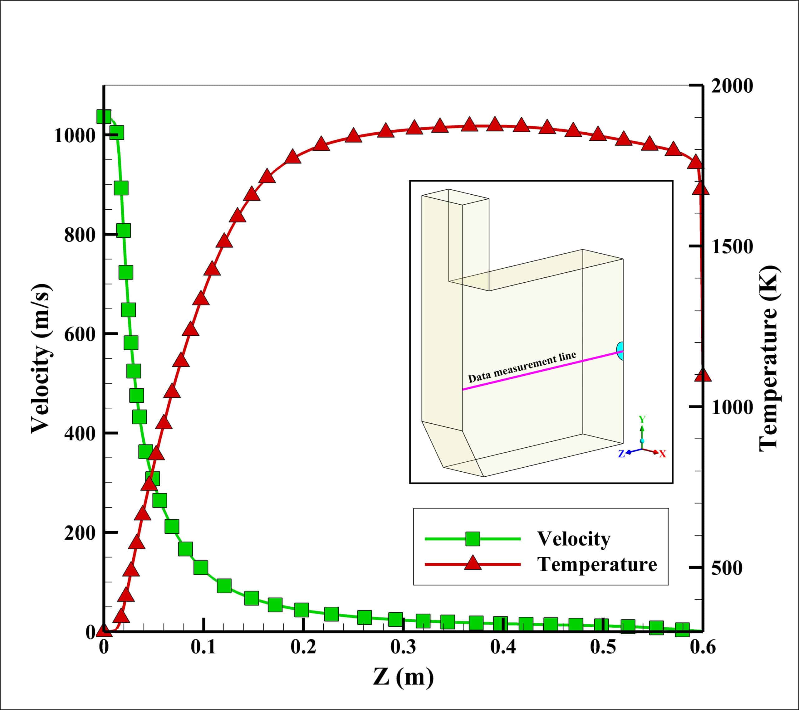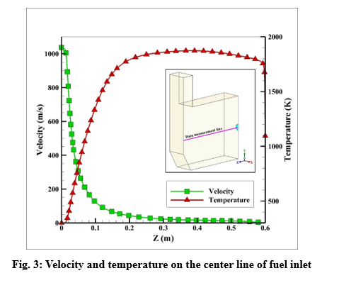 Velocity and temperature curves on the center line of fuel inlet are illustrated in Fig. 3. The maximum velocity was 1063 m/s at the fuel inlet, and the maximum temperature obtained 1860 K.