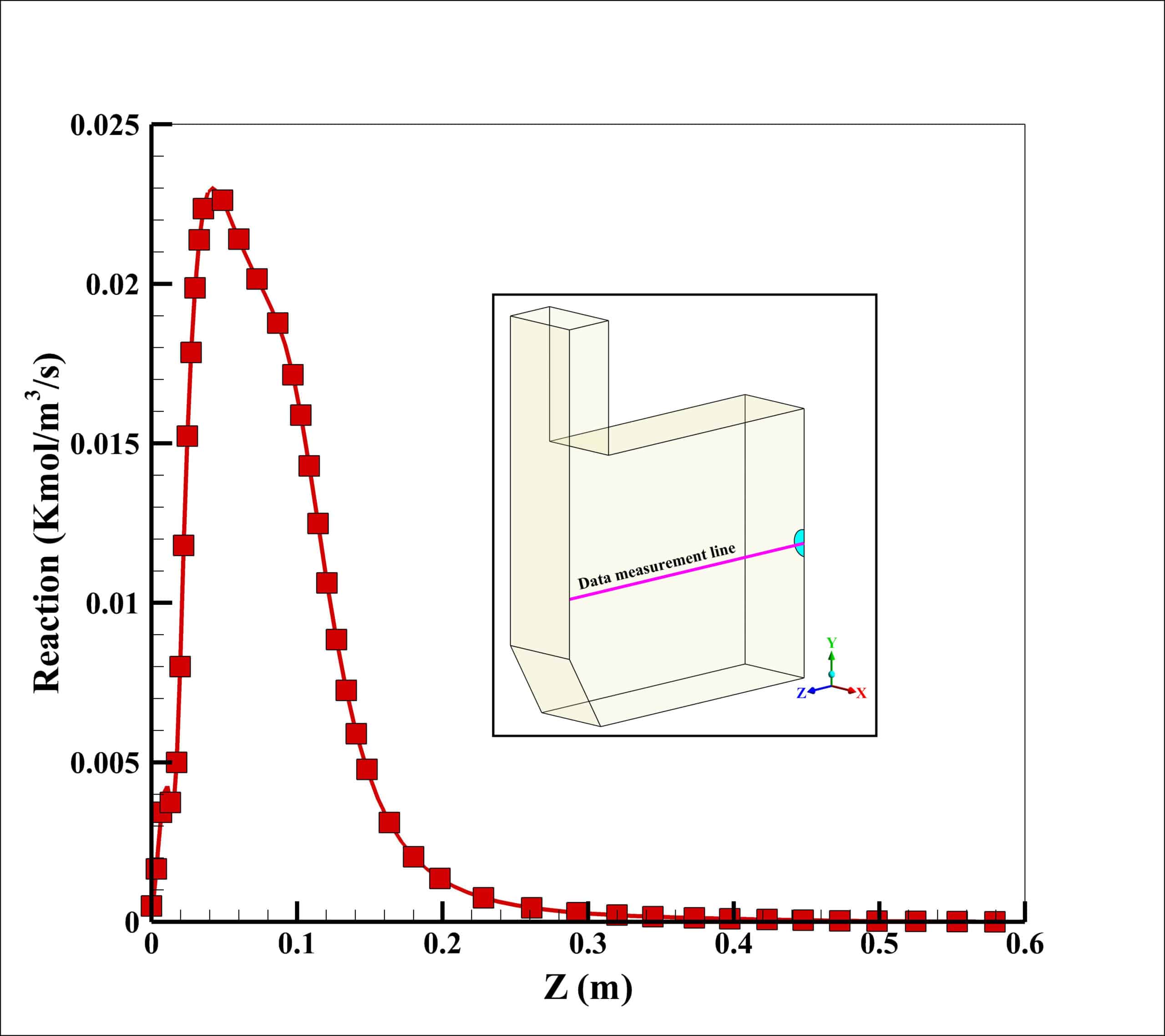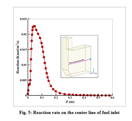 The maximum reaction rate also occurred at a distance of 2 cm from the entrance, which is 0.23 kmol/m3/s. After a distance of 0.4 meters, the reaction rate has reached zero, which indicates the completion of the flame.