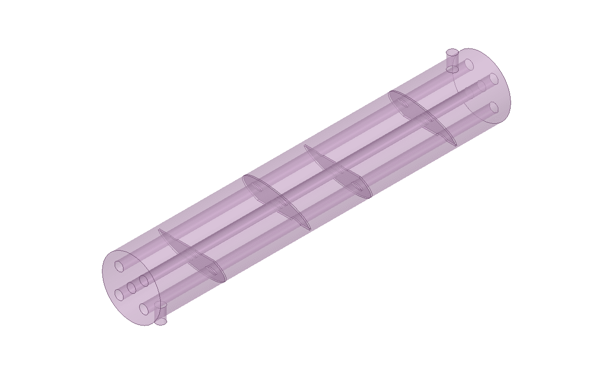 In this project, we aim to find the optimal design of a shell and tube heat exchanger equipped with baffle cuts using ANSYS Workbench modules. The figure below shows a shell and tube heat exchanger with 4 baffle cuts and 5 hot tubes in the center.