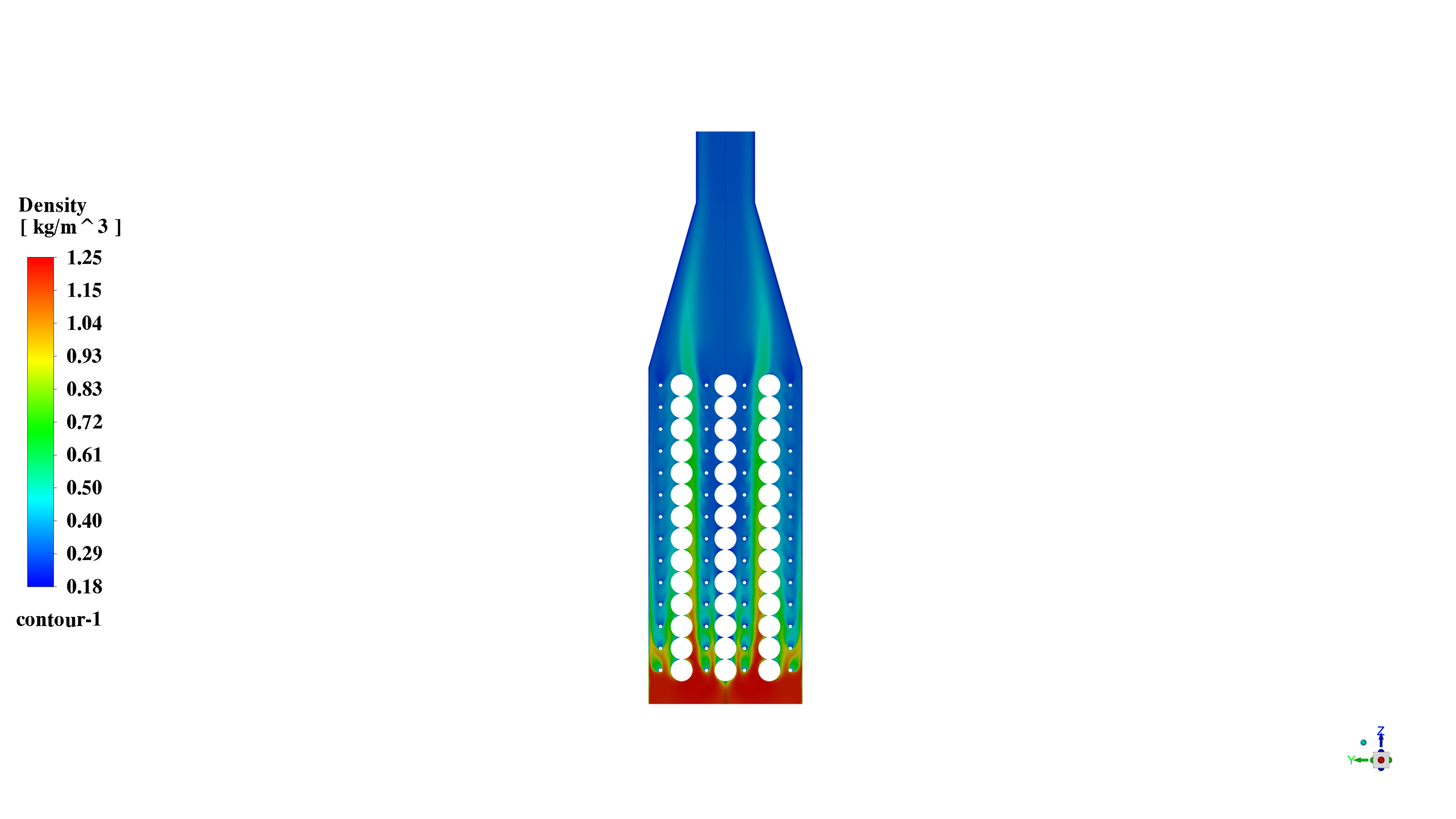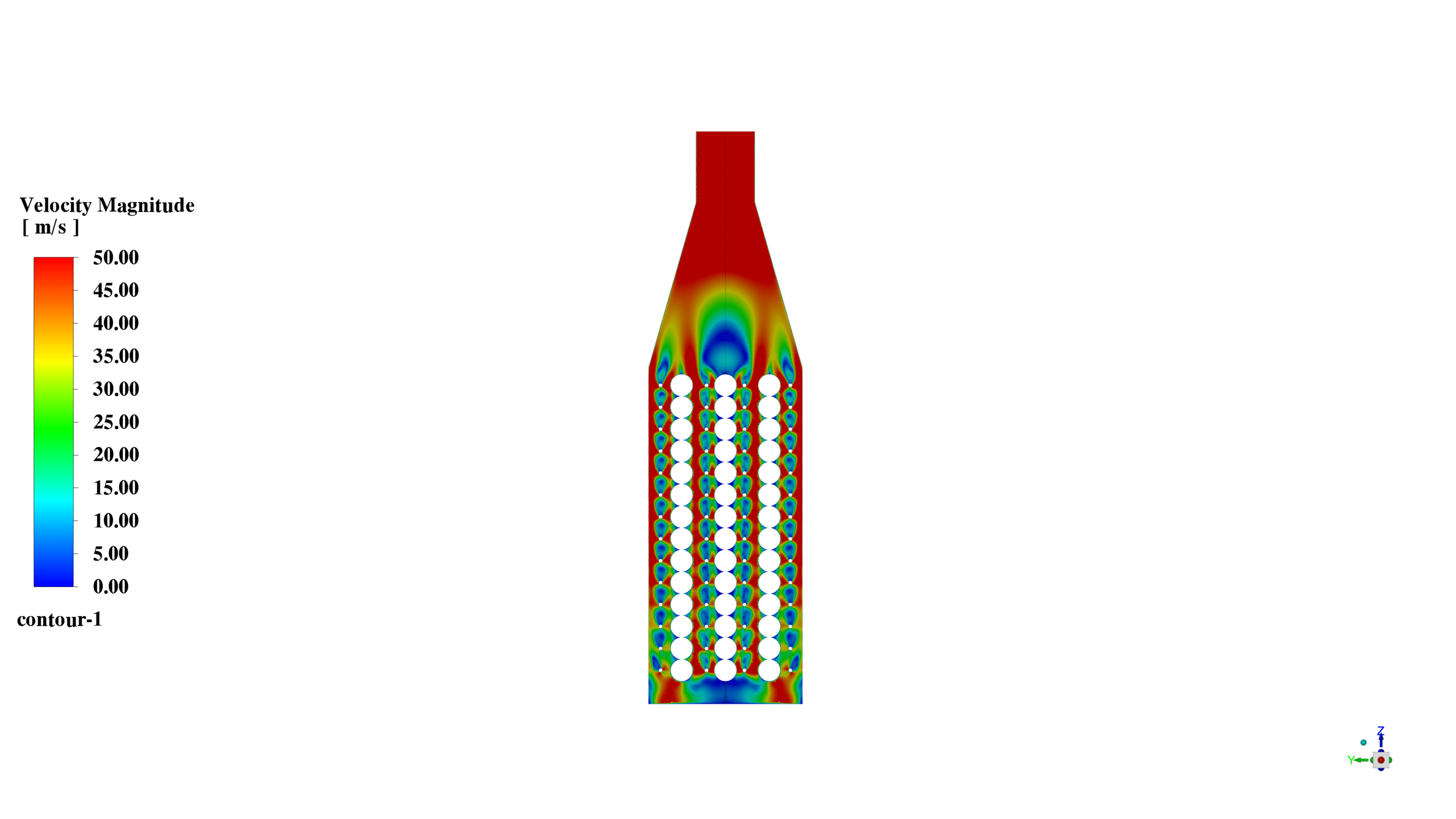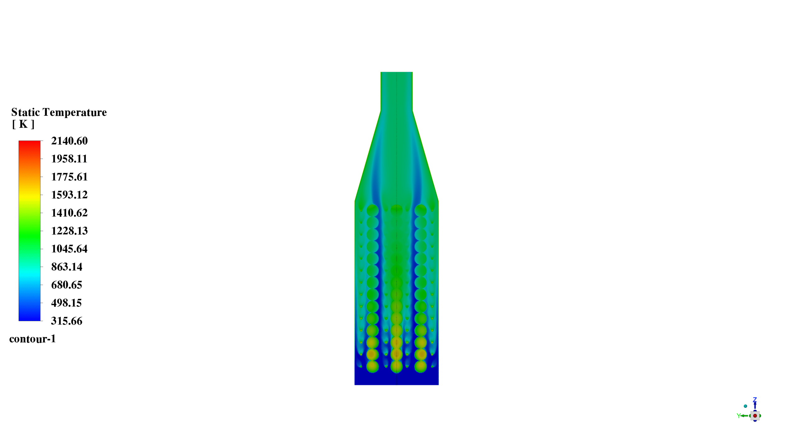 The simulation results show a significant temperature gradient within the reactor. The outlet temperature reaches 1120.819 K, indicating effective heat generation and transfer from the spherical particles to the fluid. The static temperature contour reveals that the highest temperatures are observed in the central region of the packed bed, with cooler zones near the walls and at the top of the reactor.