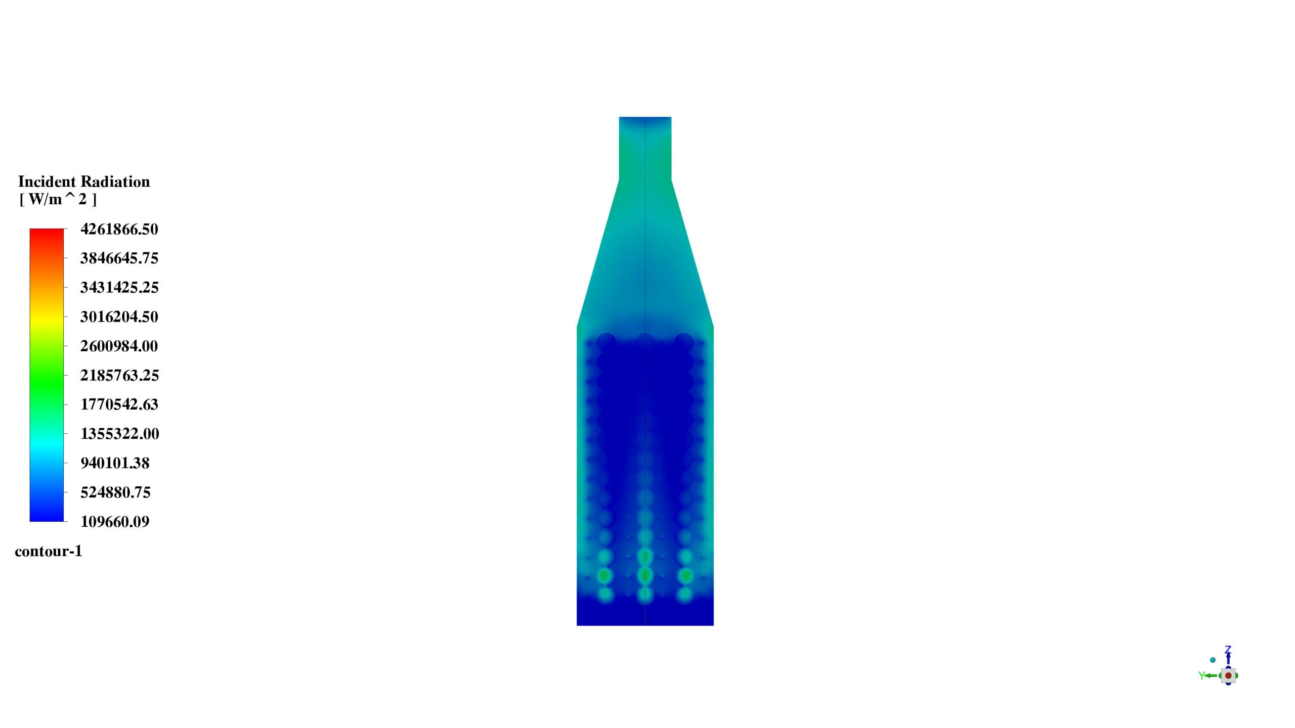 The incident radiation contour demonstrates the importance of radiative heat transfer in the system. The highest radiation intensities are observed near the heat-generating spheres, with values reaching up to 4,261,866.50 W/m². This radiative heat transfer contributes significantly to the overall temperature distribution within the reactor.