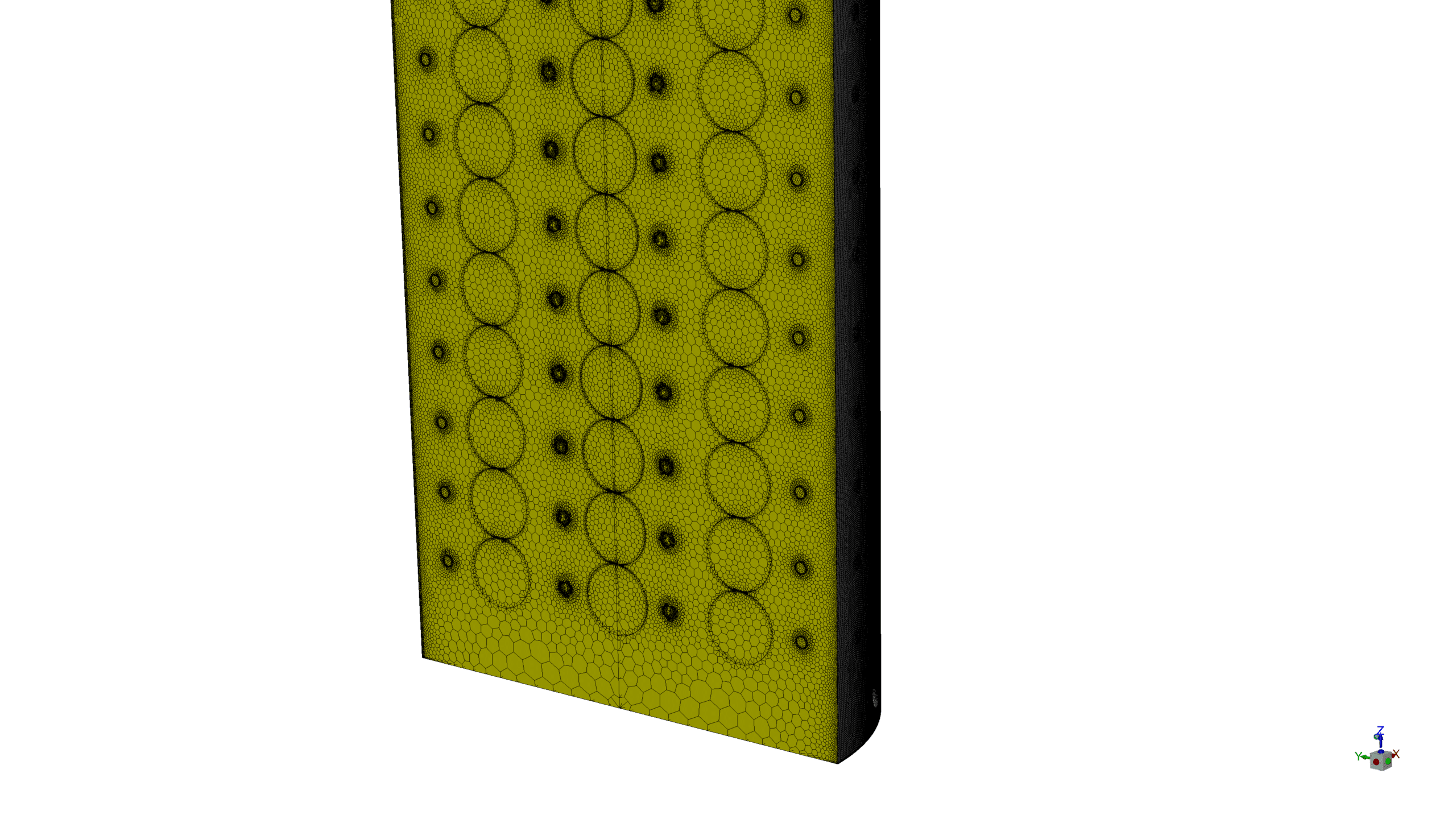 The CFD simulations were conducted using ANSYS Fluent software. The computational domain includes a cylindrical vessel with 14 layers of spherical particles. The geometry was designed using the ANSYS Design Modeler, which represents an industrial-scale packed bed reactor. The mesh was generated using ANSYS Meshing software, with approximately 4 million polyhedra elements, ensuring adequate resolution for capturing the complex flow and heat transfer phenomena around the spherical particles.