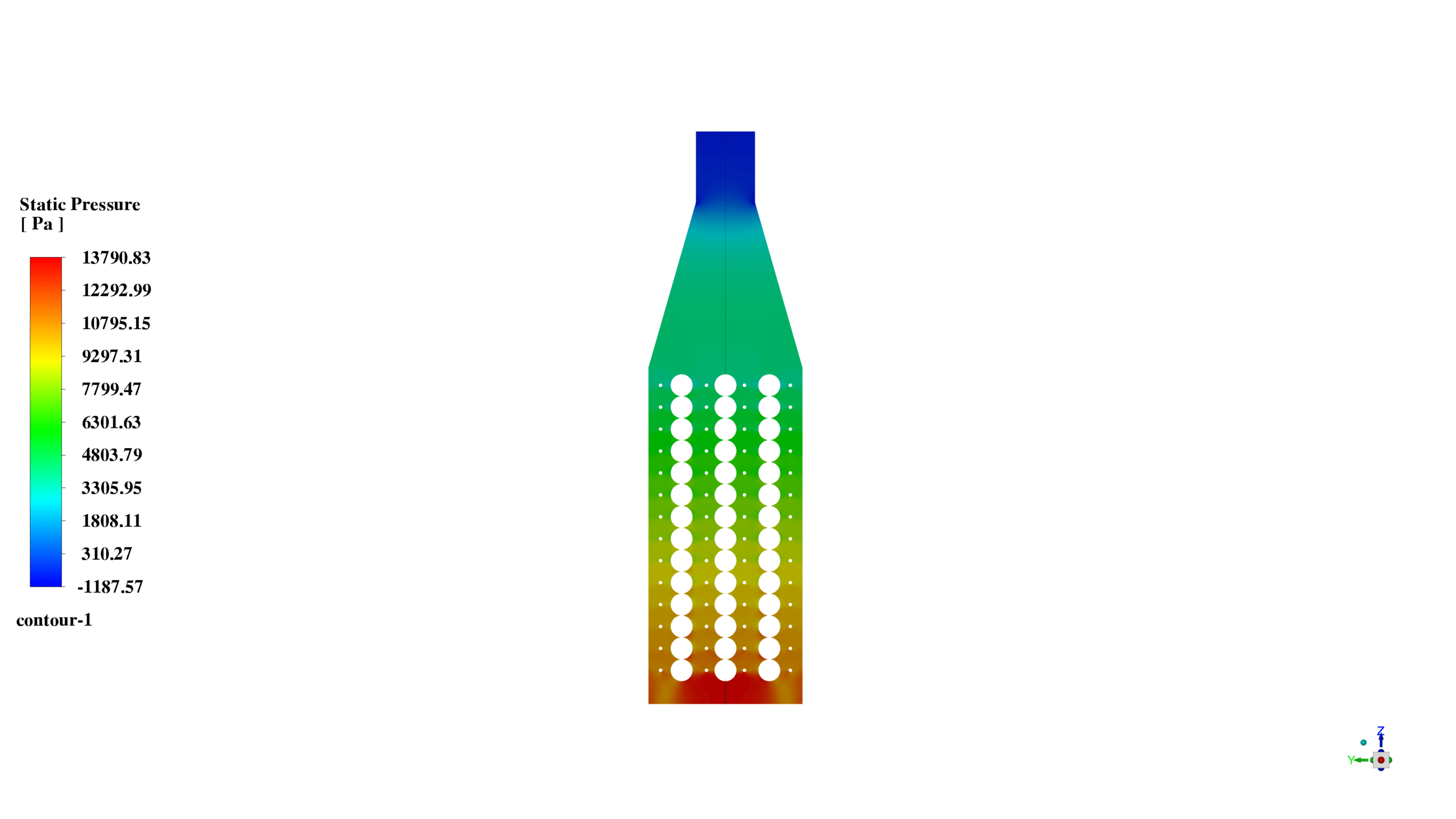 The static pressure contour indicates a pressure gradient from the bottom to the top of the reactor, which is typical for packed bed systems. This pressure drop is a result of the flow resistance caused by the spherical particles and plays a crucial role in determining the overall performance of the reactor.