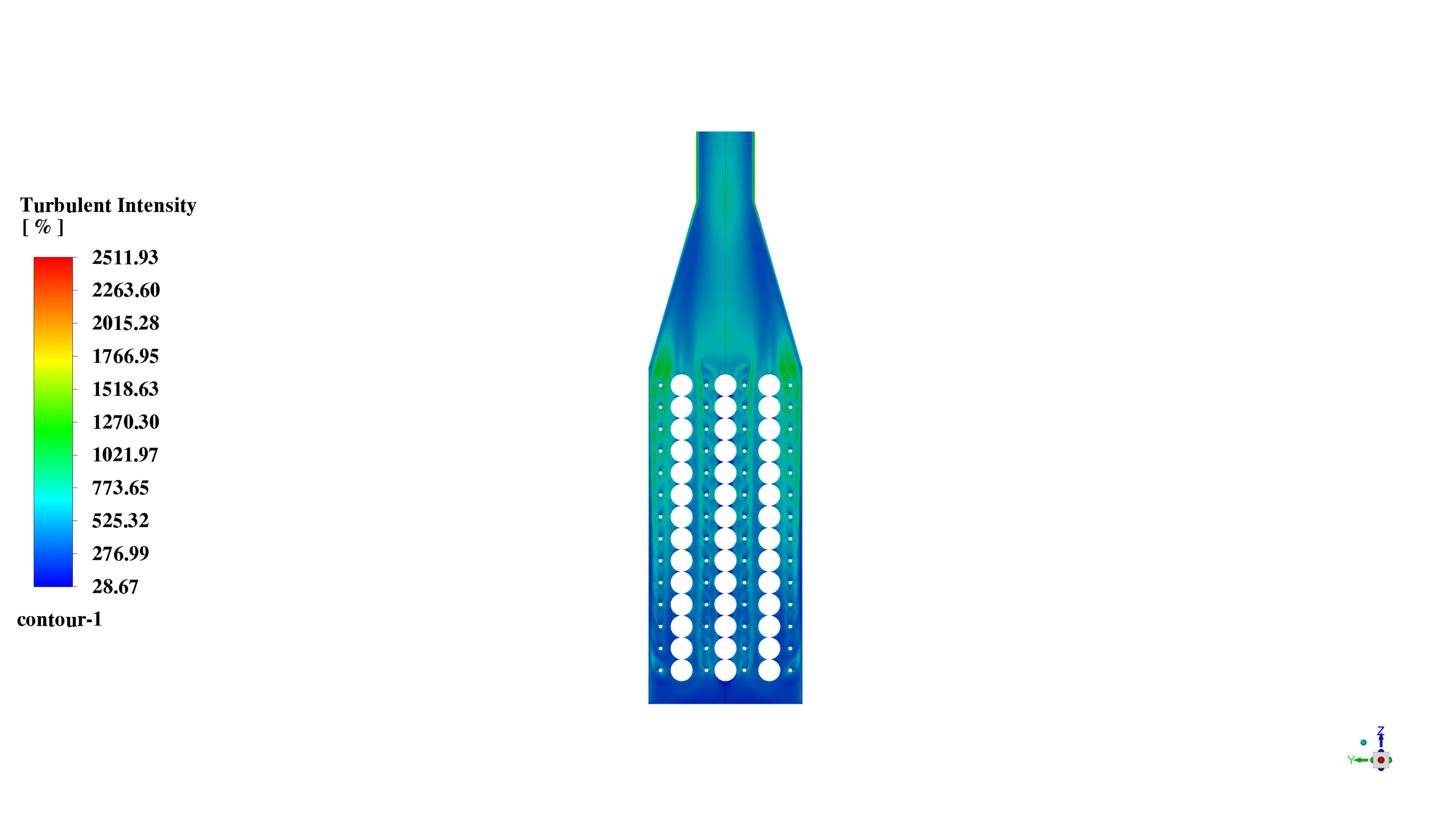 The turbulent intensity contour reveals areas of high turbulence, particularly in the spaces between spheres and near the reactor walls. The maximum turbulent intensity reaches 2511.93%, indicating highly turbulent flow conditions that enhance mixing and heat transfer.