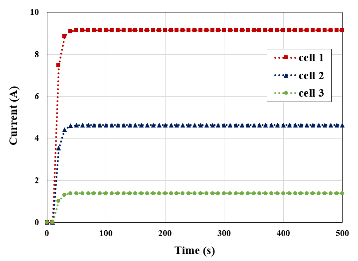 In addition, we obtained contours of current magnitude, cell voltage, and passive zone potential for both parallel and series cases. The contours confirm the plots of the potential and current.