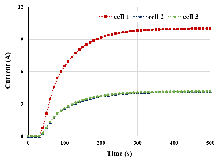 As shown, in parallel connection, the voltage of all three batteries is the same and the current in the batteries decreases respectively. However, in serial connection, the voltage of the batteries drops in sequence, while the current stabilizes.