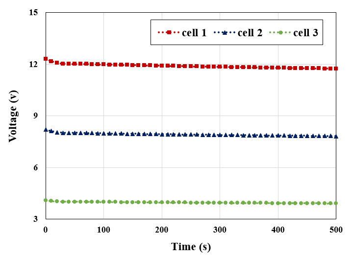 We obtained potential (voltage) and current plots based on time for both parallel and serial battery packs.