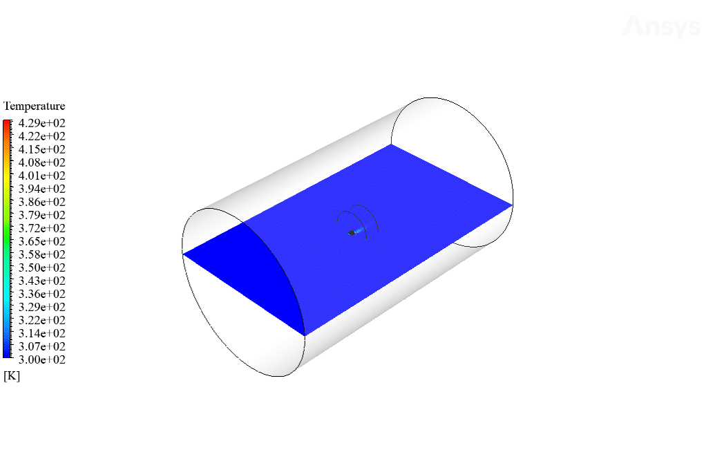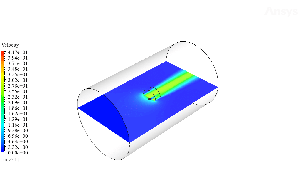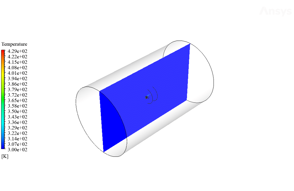 The present simulation is about a paramotor in a paraglider via ANSYS Fluent. A paramotor is the propulsion part of a paraglider that attaches to the pilot’s seat. These engines are powered by gasoline and have fan blades attached to them. This simulation defines a cylindrical computational domain for airflow with a temperature of 26.85 C. For inlet and outlet boundaries of this domain, a pressure boundary condition is defined to determine the direction of air movement according to the amount of pressure. In the middle part of this model, a surface is defined as a fan, and the fan boundary condition with 383.8-pascal pressure jump is used. The aluminum casing of the engine with its thermocouple is defined behind the fan; It is assumed that the inner wall inside the engine has a constant temperature equal to 157 C. It is assumed that this temperature is defined based on the heat generated by the combustion inside the engine.