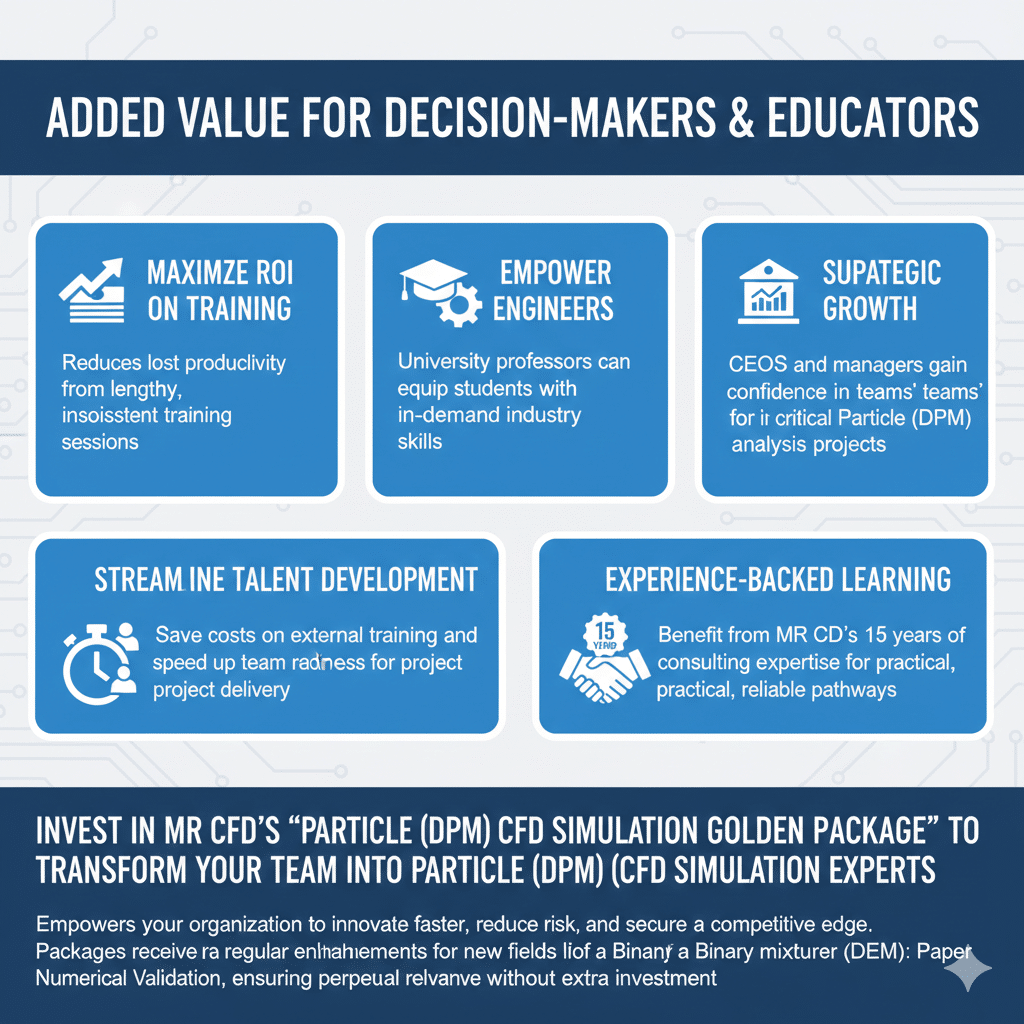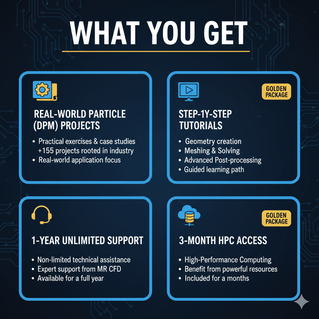 Invest in MR CFD’s “Particle (DPM) CFD Simulation Golden Training Package” and transform your team into Particle (DPM) CFD simulation experts ready to meet today’s and tomorrow’s engineering challenges. This turnkey solution empowers your organization to innovate faster, reduce risk, and secure a competitive edge with confidence.