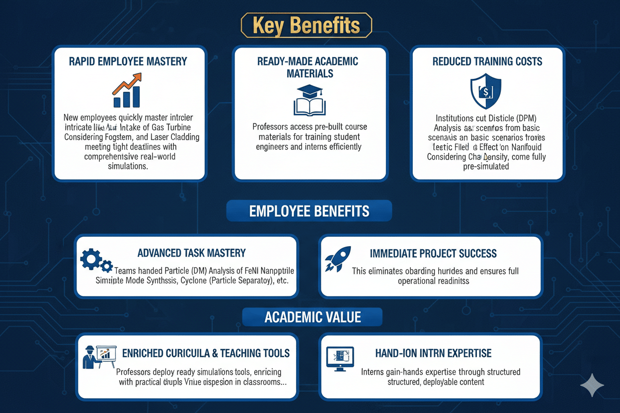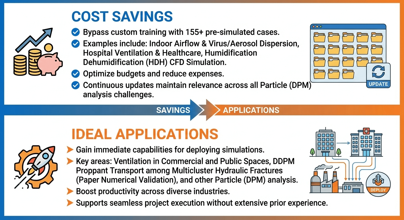 Organizations bypass custom training by leveraging over 155 pre-simulated cases, from Indoor Airflow and Virus/Aerosol Dispersion, Hospital Ventilation and Healthcare, to Humidification Dehumidification (HDH) CFD Simulation, optimizing budgets. Continuous updates maintain relevance across all Particle (DPM) analysis challenges.