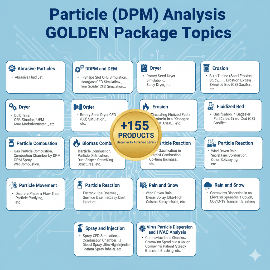 Particle (DPM) CFD Simulation GOLDEN Training Package by MR CFD is a complete learning bundle that turns students and engineers into expert users of particle-based CFD methods in ANSYS Fluent. With more than 155 step‑by‑step tutorials covering DPM, DDPM, and DEM applications from erosion and spray to virus dispersion and HVAC, it equips teams to handle real industrial particle analysis projects with confidence. Backed by 15 years of MR CFD consulting experience, the package includes practical case studies, full workflow training, one year of expert support, and temporary HPC access to fast‑track onboarding and reduce training costs for universities, institutes, and companies.