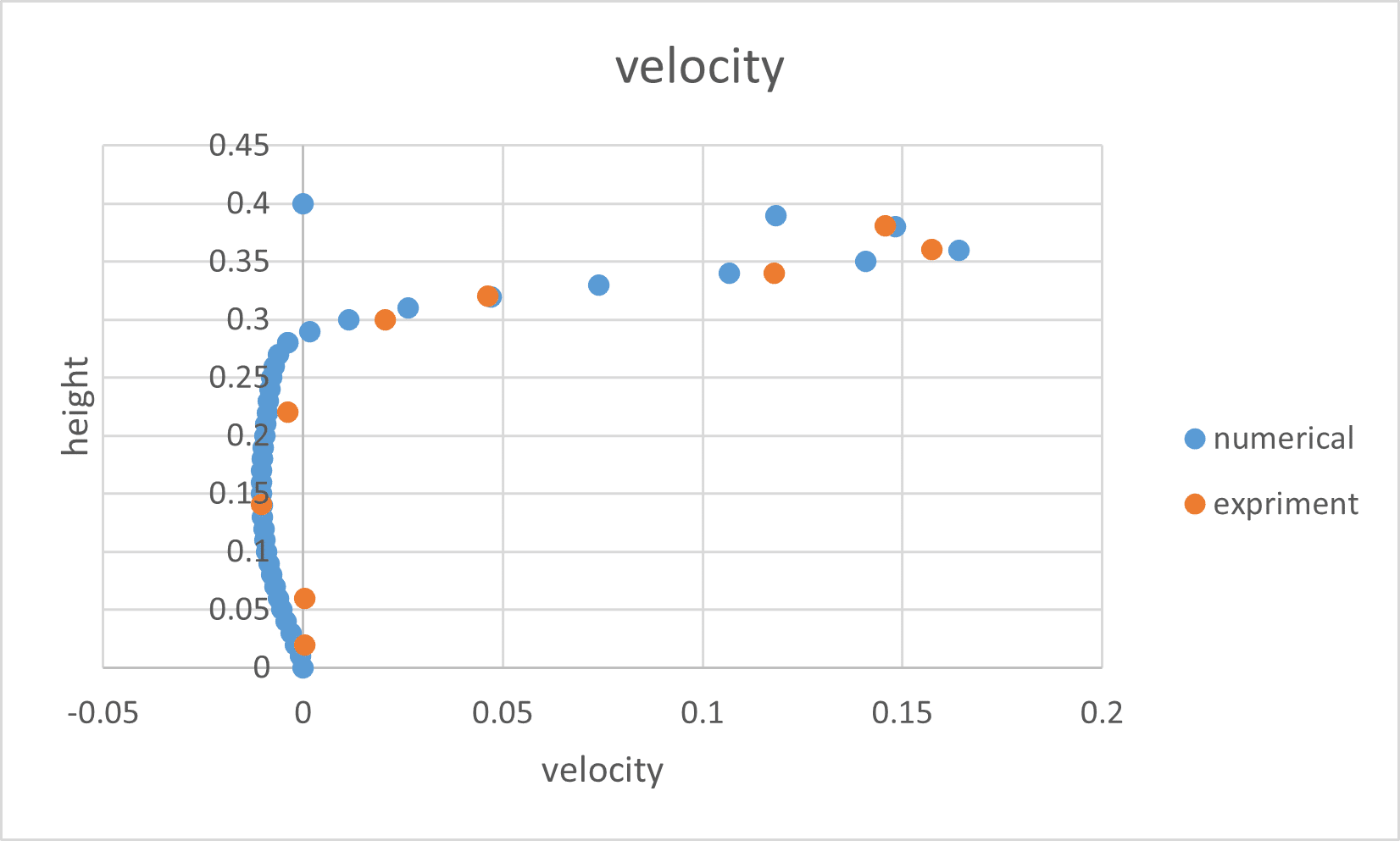 In the following graph, the velocity along the center line, with a length of 0.2 m, is shown for both numerical and experimental results.