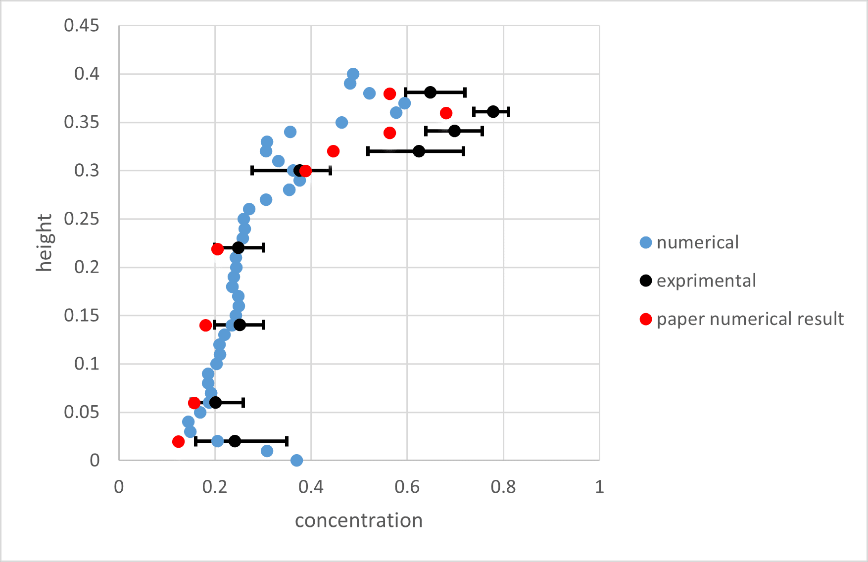 In the following graph, the DPM concentration along the center line with a length of 0.2m is shown for both numerical and experimental results.